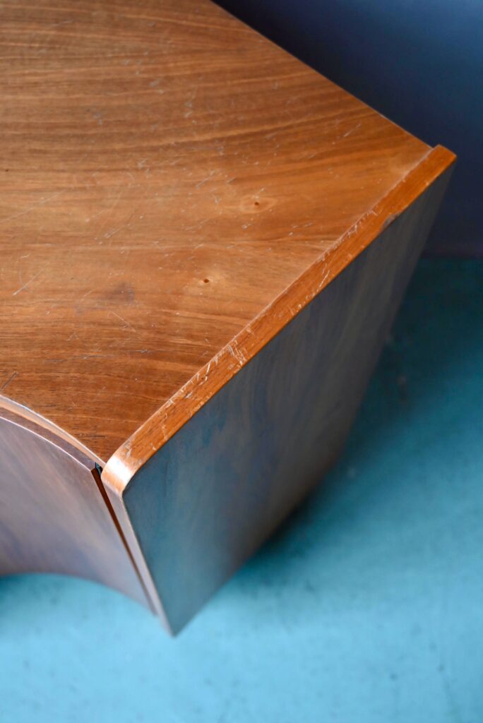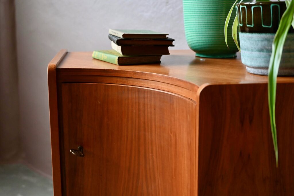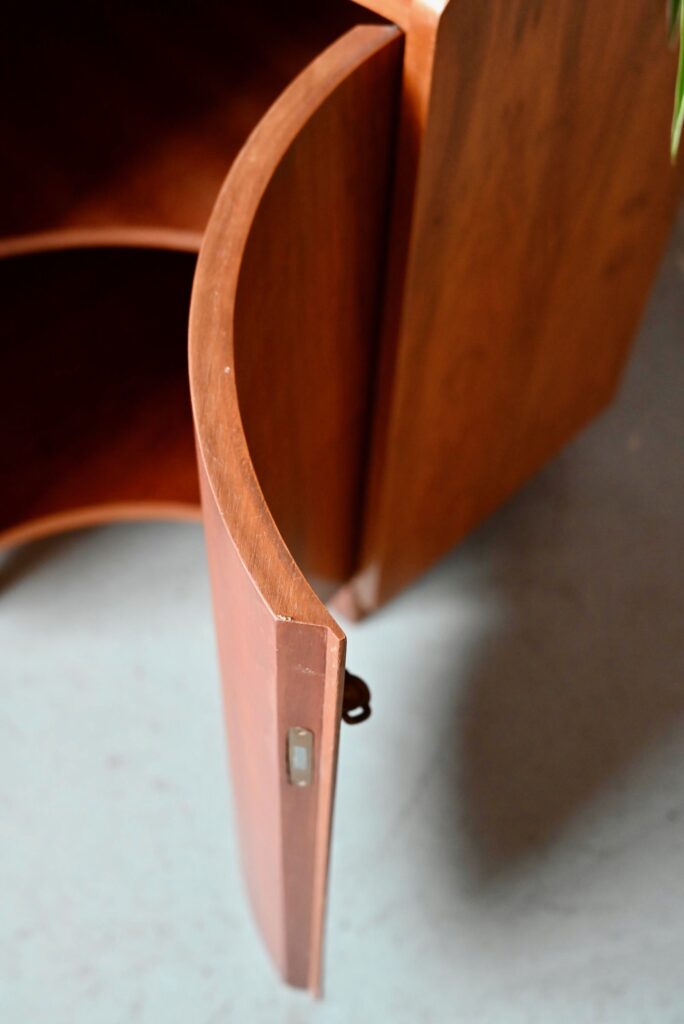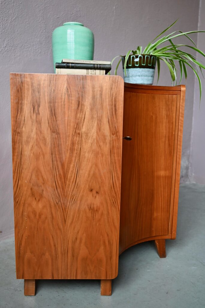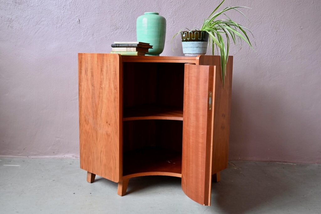Cette commode ou meuble d’angle est une production des années 60. Atypique, par sa forme et sa conception, elle est dotée de pieds compas et d’une porte en arc-de-cercle. Dans les espaces restreints, ce type de meuble permet de gagner de la place et de la profondeur tout en proposant un rangement intéressant. C’est un petit meuble TV ou Hifi parfait!