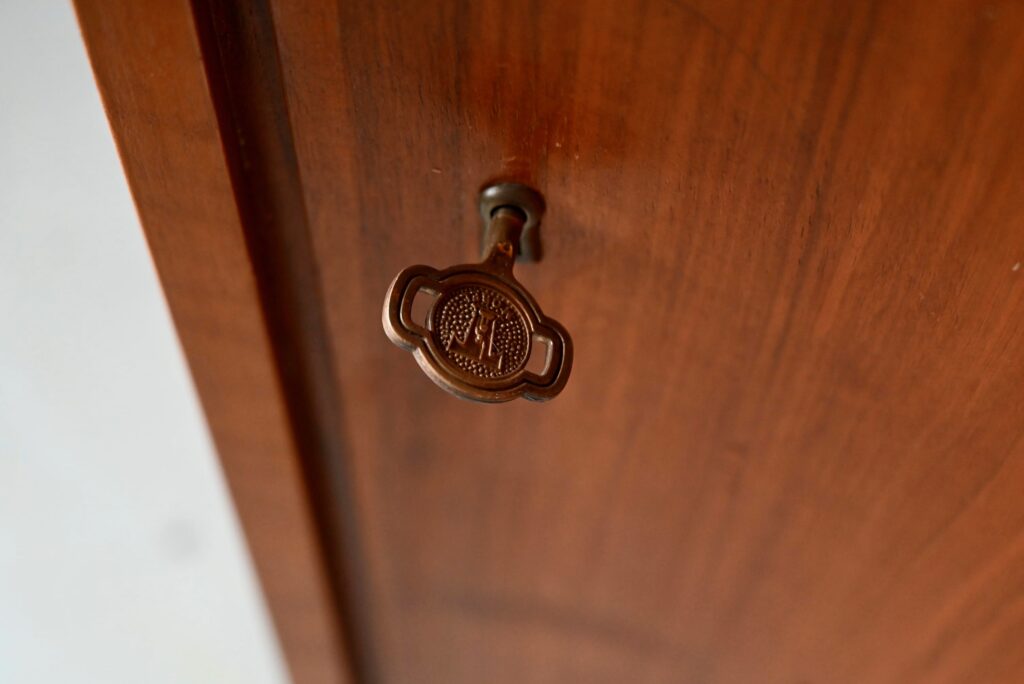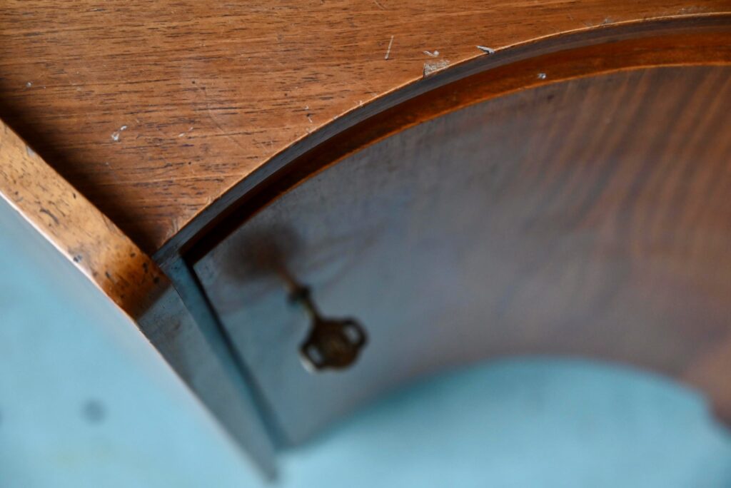Le meuble d’angle est ancien et date des années 60. C’est un très beau meuble d’angle, facile à intégrer dont le design est d’inspiration scandinave. Le caisson est posé sur un piétement compas. Des traces d’usage sont présentes, notamment sur le plateau et les arêtes du meuble, visibles en photo. Serrure et clef sont d’origine, en métal doré.