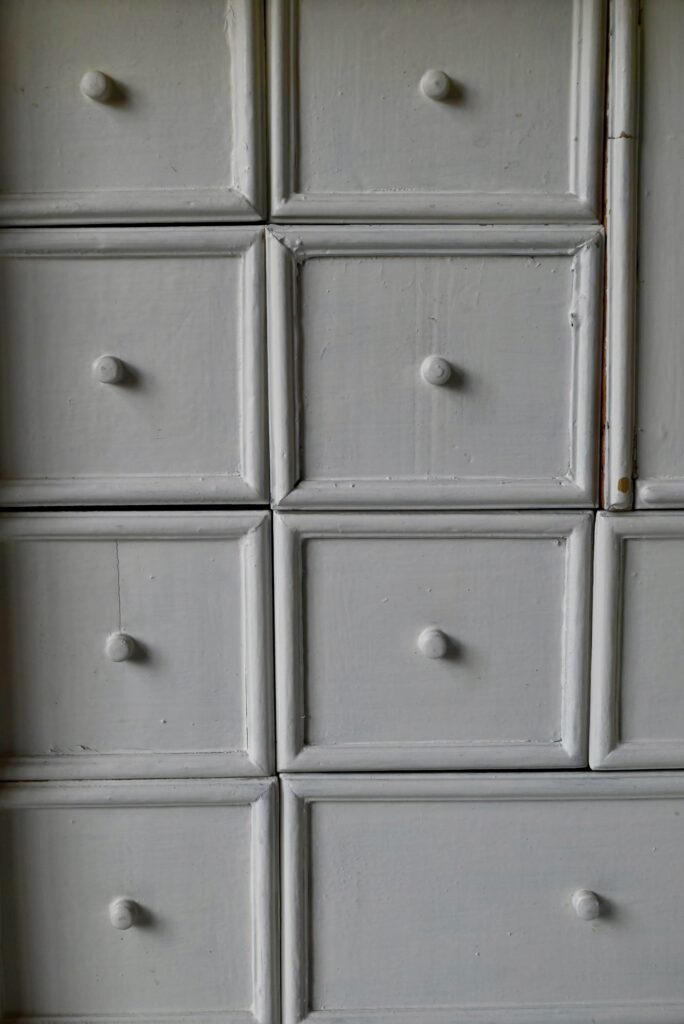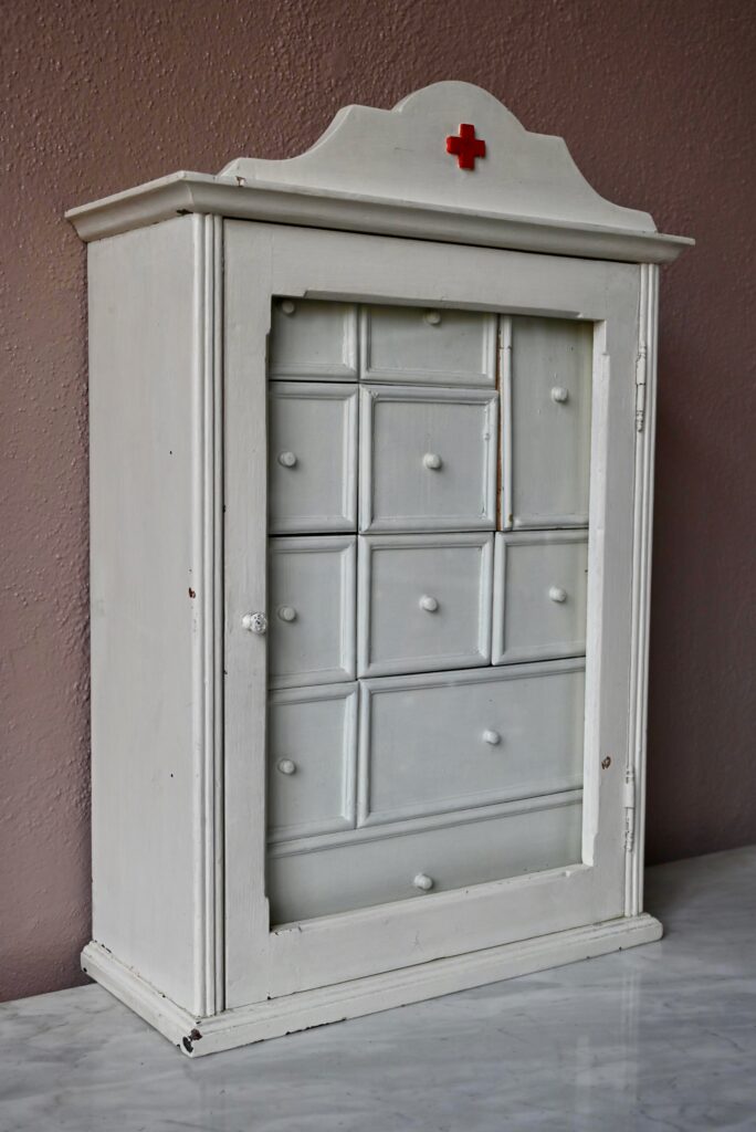 L’armoire est très ancienne et date des années 1930-40. Elle est en bois, la peinture blanche est d’origine. Elle dispose de jolis détails de fabrication et d’une porte en verre. Une multitude de petits tiroirs sont visibles à l’intérieur. Sur le fronton, une jolie croix rouge ajoute au charme de cette pièce peu commune. L’armoire est en très bel état. Un système de fixation est prévu à l’arrière.