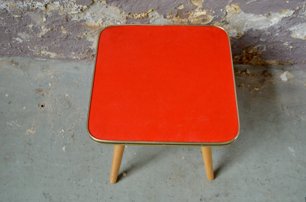 Le petit guéridon est en très bon état. Il date des années 60. Le plateau est en formica rouge bordé d’un chant en vinyle doré.
