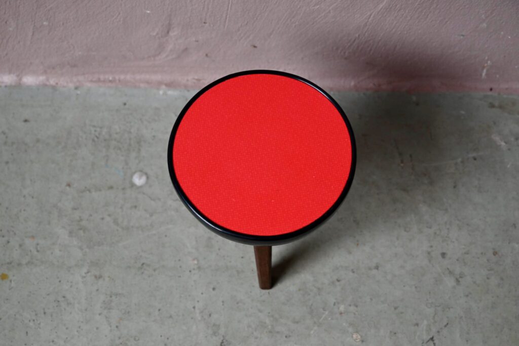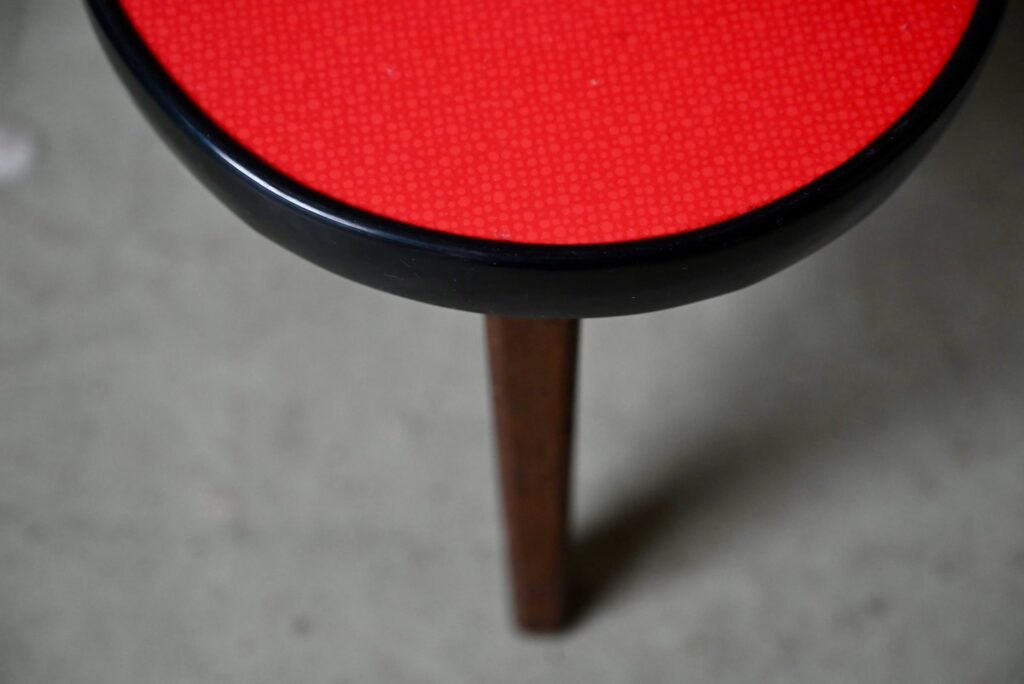 Le piétement tripode est en bois massif foncé. Le plateau est en formica® rouge. Le chant en vinyle noir est en bon état.