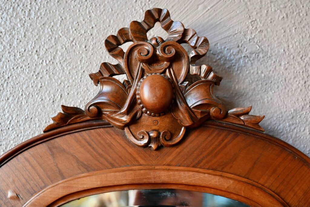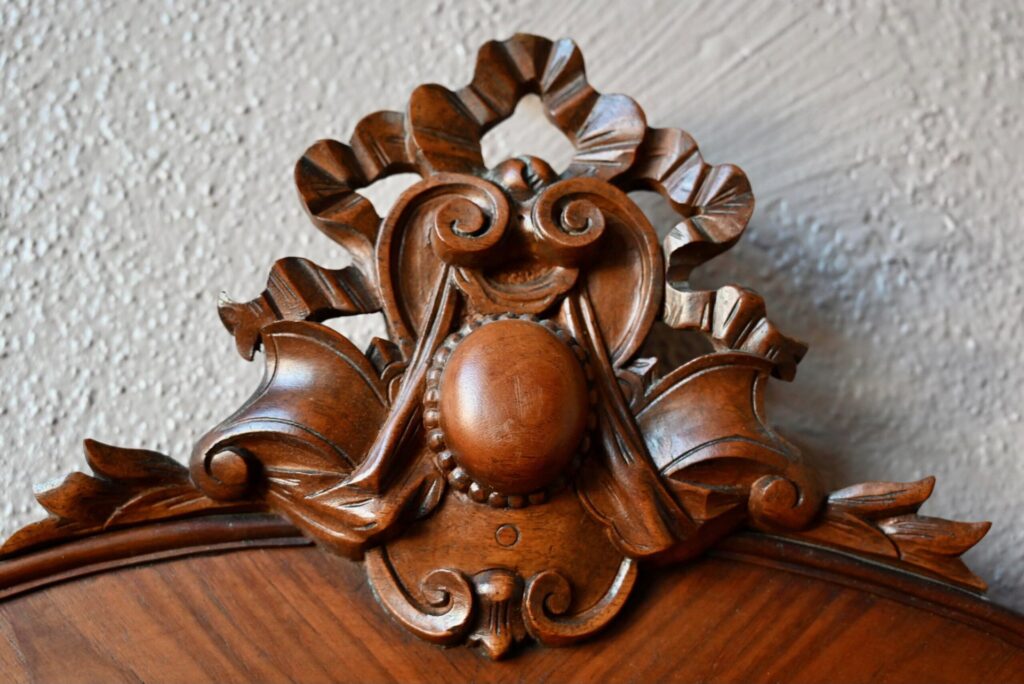 Voici un miroir biseauté emprunt de délicatesse et de poésie. Le cadre est large, avec un joli travail mettant en valeur le bois. Il est surmonté d’un haut fronton en bois sculpté mettant en scène, médaillon, nœuds et rubans en bois sculpté. La glace, de forme particulière, est soulignée par un contour biseauté. Très bel objet déco, ce miroir ancien sera une jolie touche douce antique et poétique.