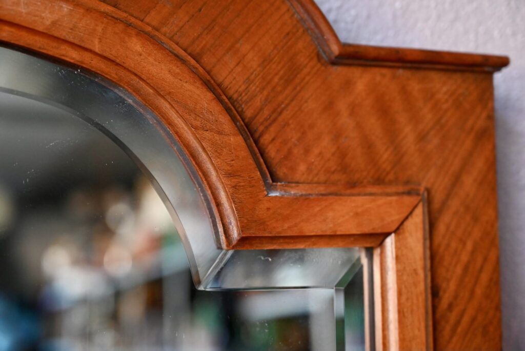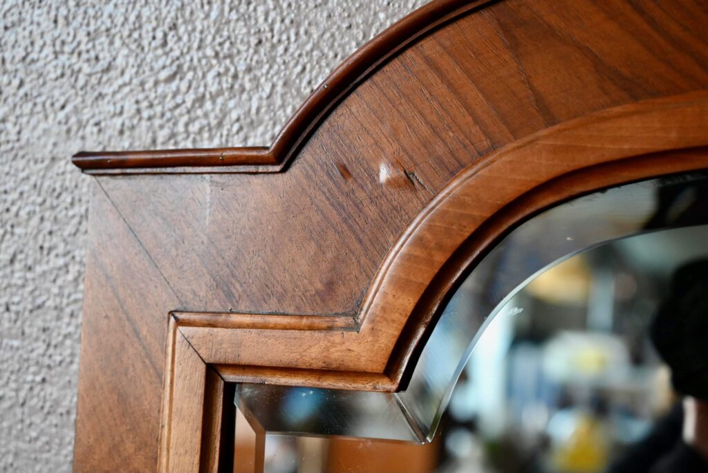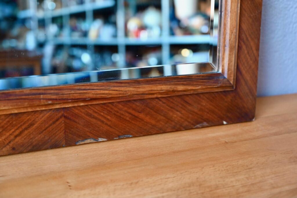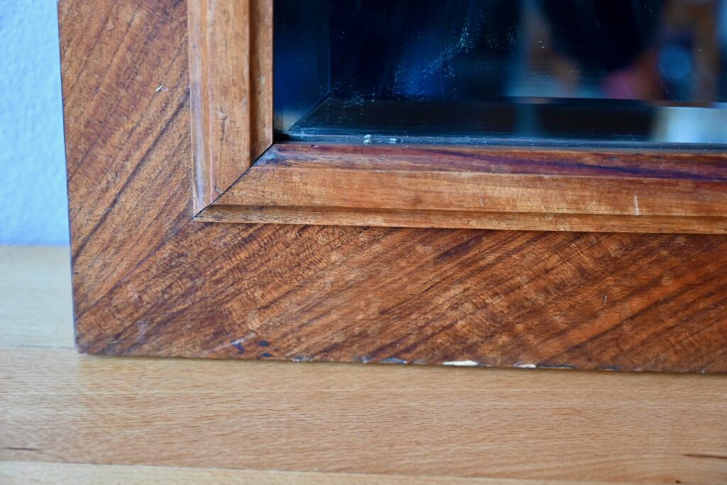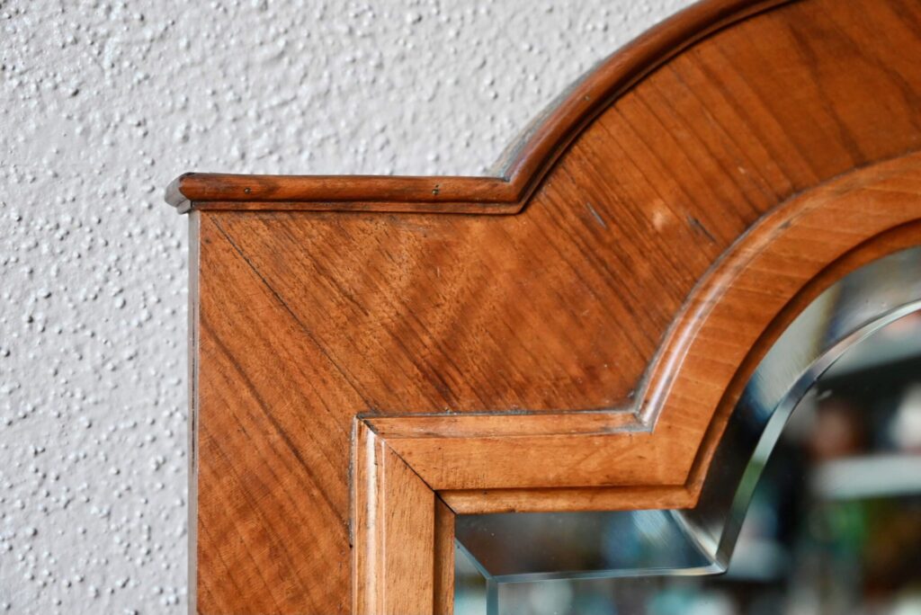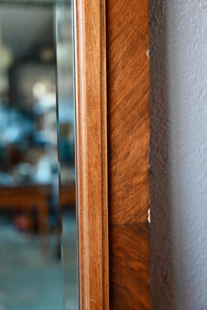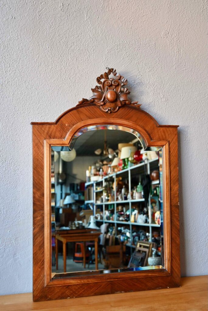 Le cadre du miroir est en placage et bois sculpté de très belle facture. De petits manques de placage et un petit décollement de celui-ci sont visibles en photo. La miroir est ancien. La glace est biseautée.