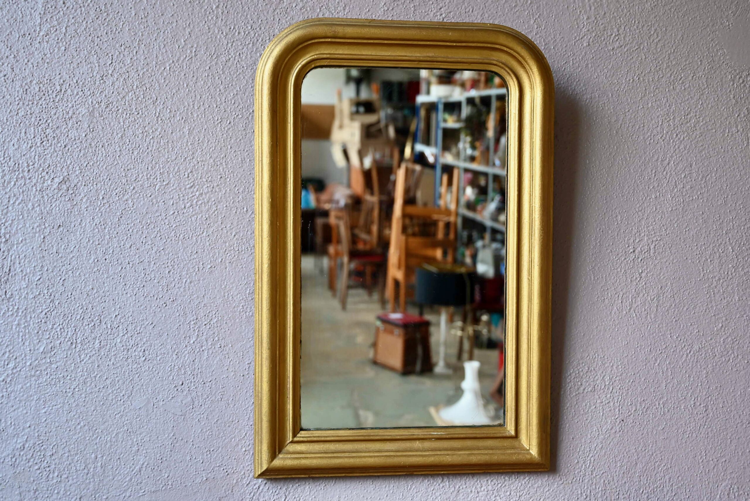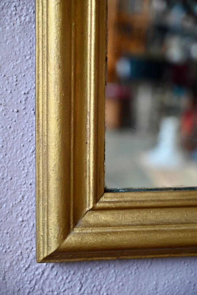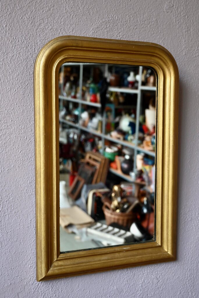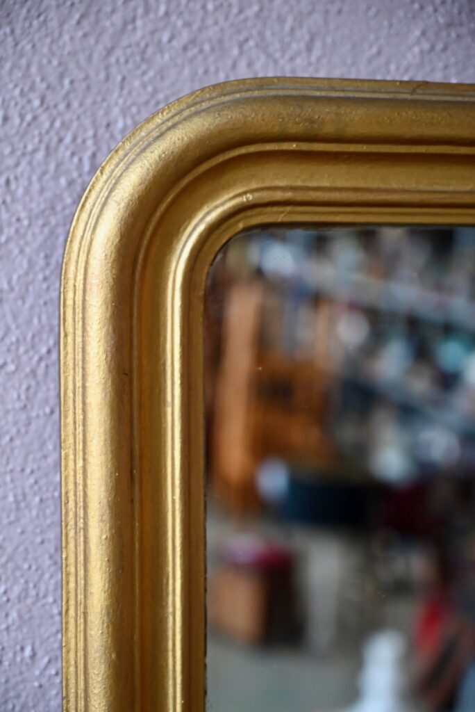 Le miroir Louis Philippe doré est ancien. Il est en bois rehaussé de stuc et présente une jolie dorure bronze or patinée. Le tain est en bel état, quelques traces d’usage sont à noter.