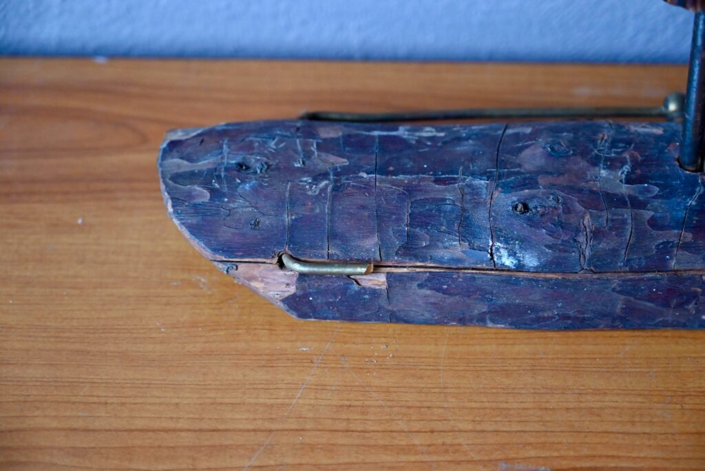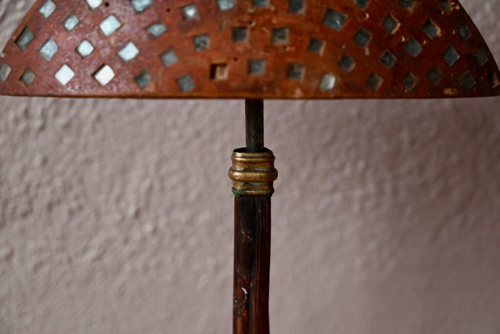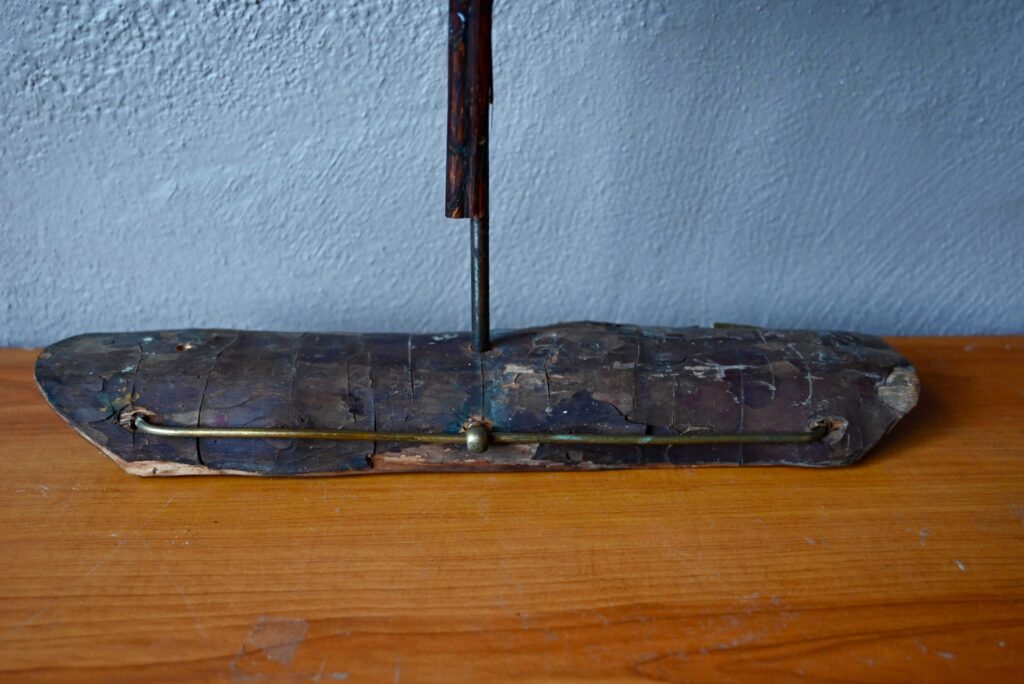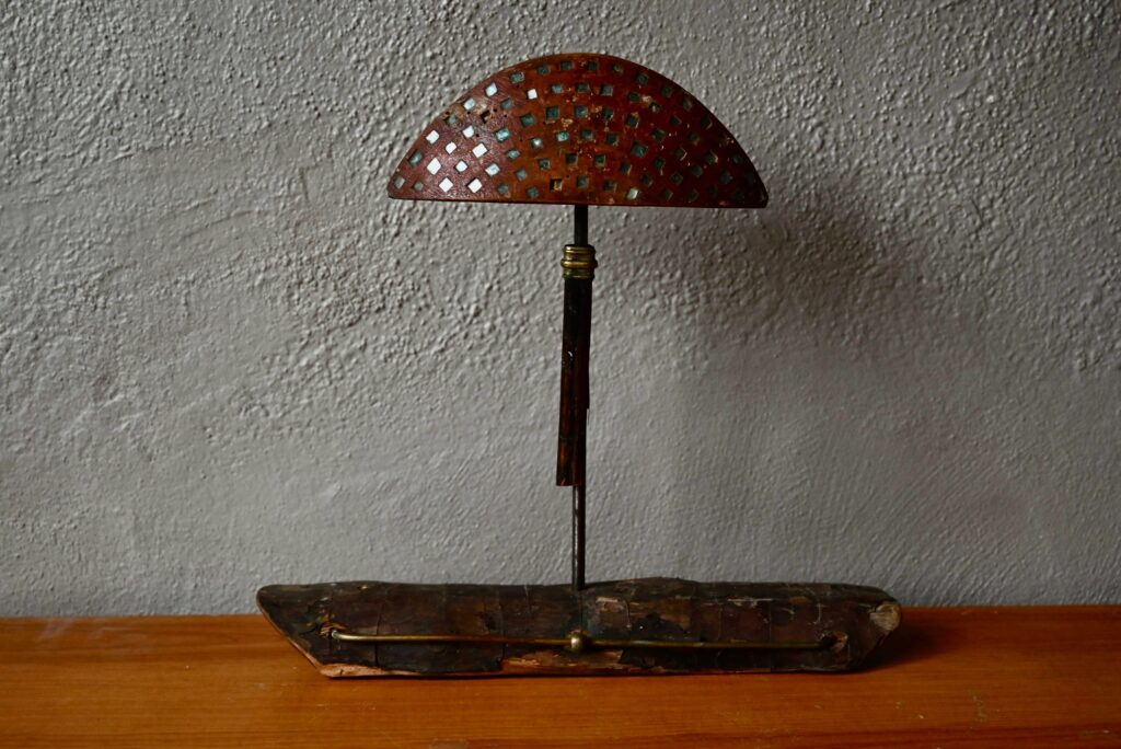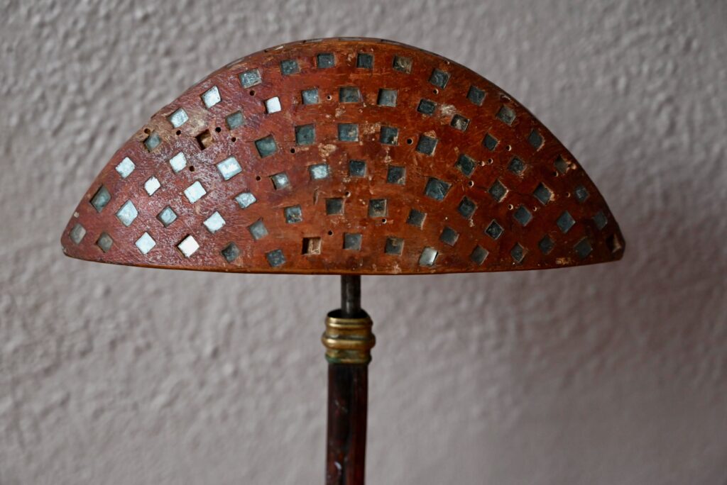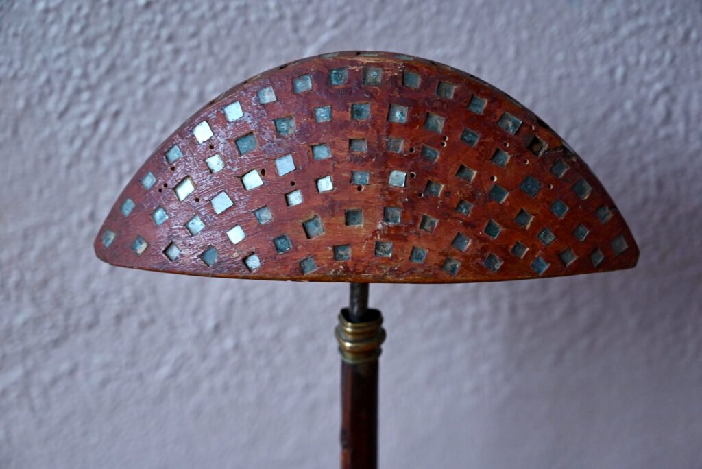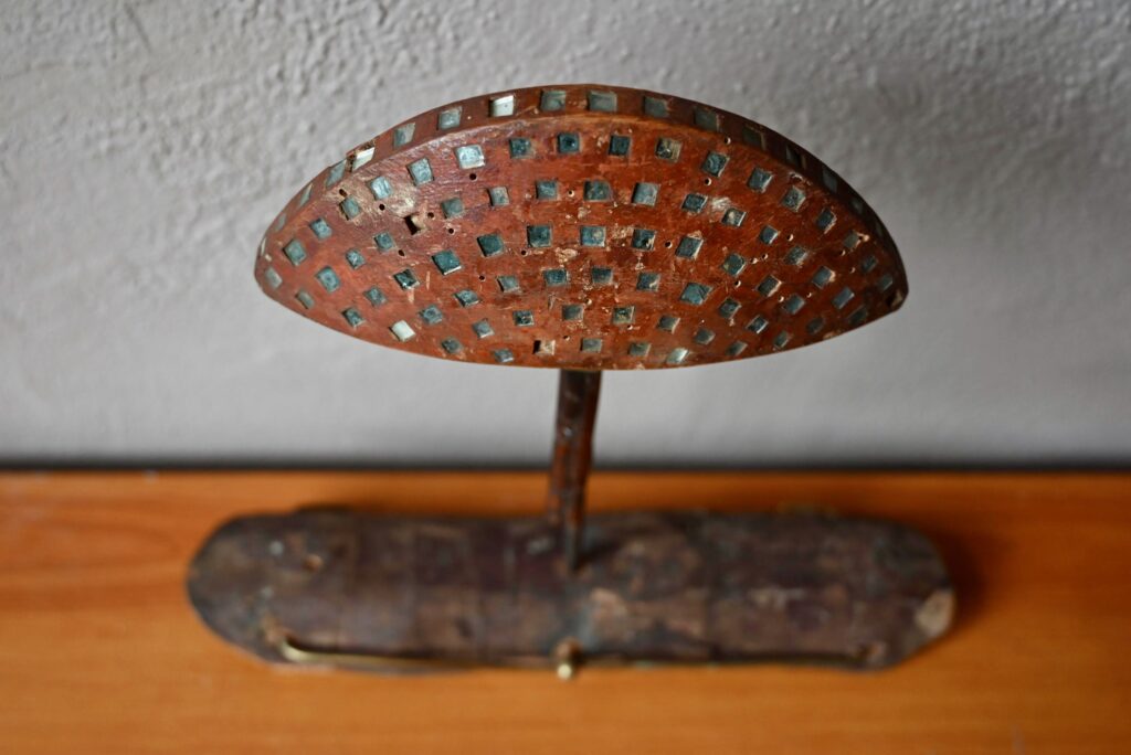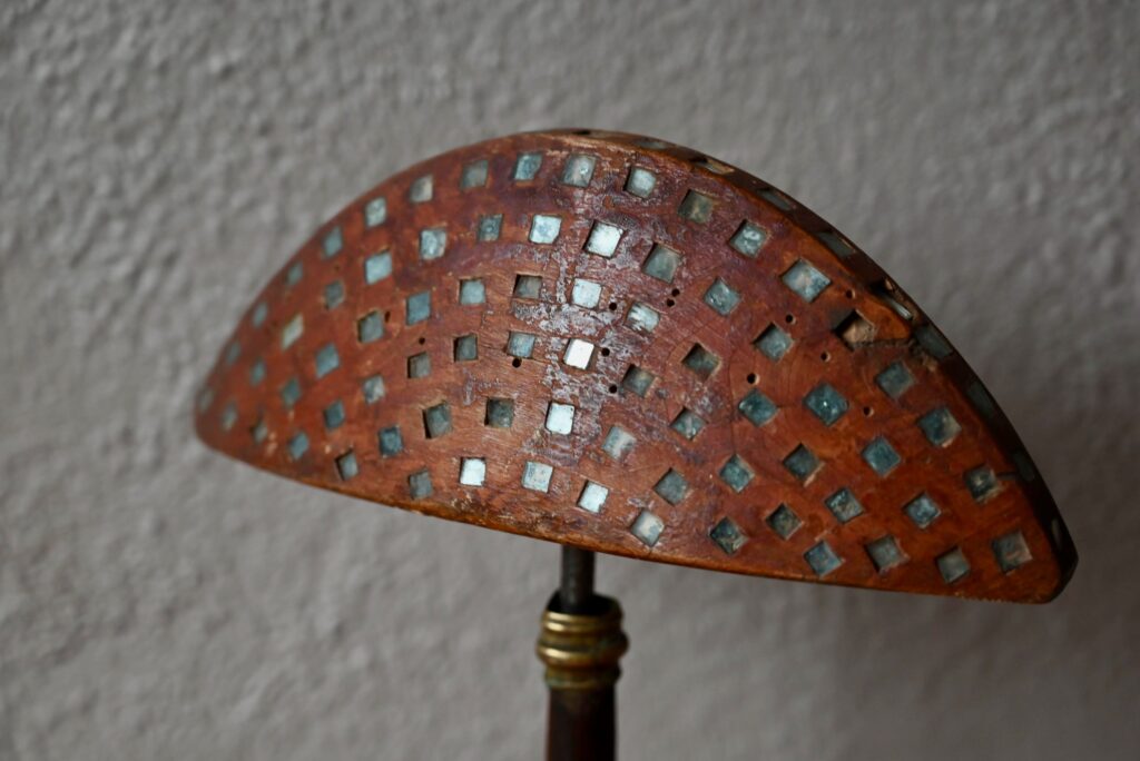 Le miroir aux alouettes est très ancien et date des années 20. Il est en bois fruitier et laiton et dispose d’une multitude de facettes miroir, certaines sont manquantes. Il est en bel état et comporte un support amovible. Miroir aux alouettes mécanique, le système à fil est manquant. Il présente quelques trous de ver discrets, le bois a été traité. C’est un bel objet authentique d’art populaire.
