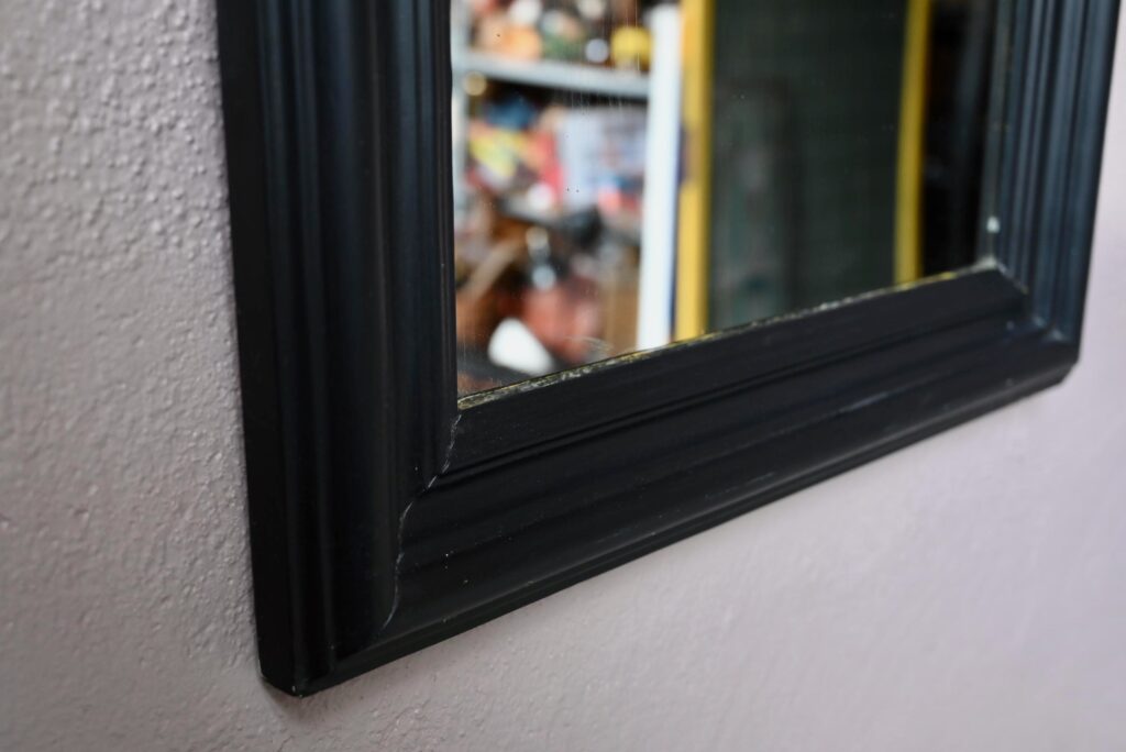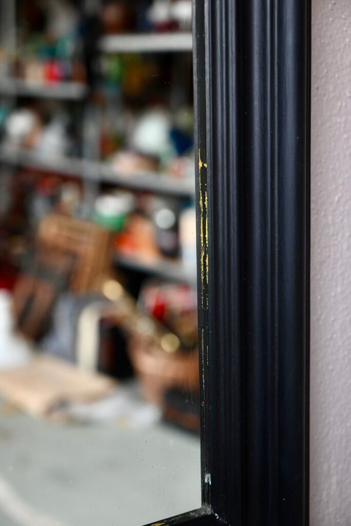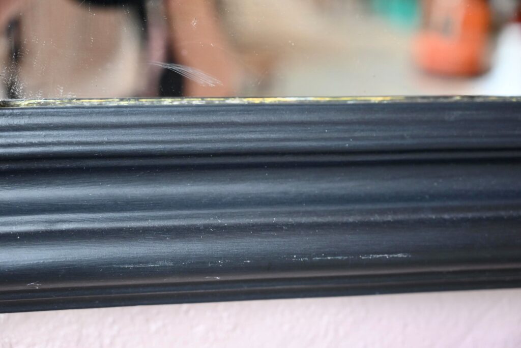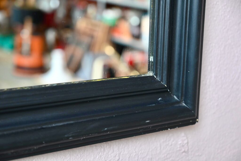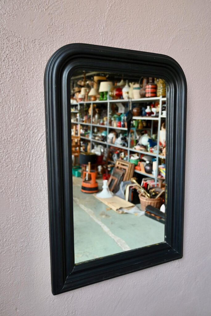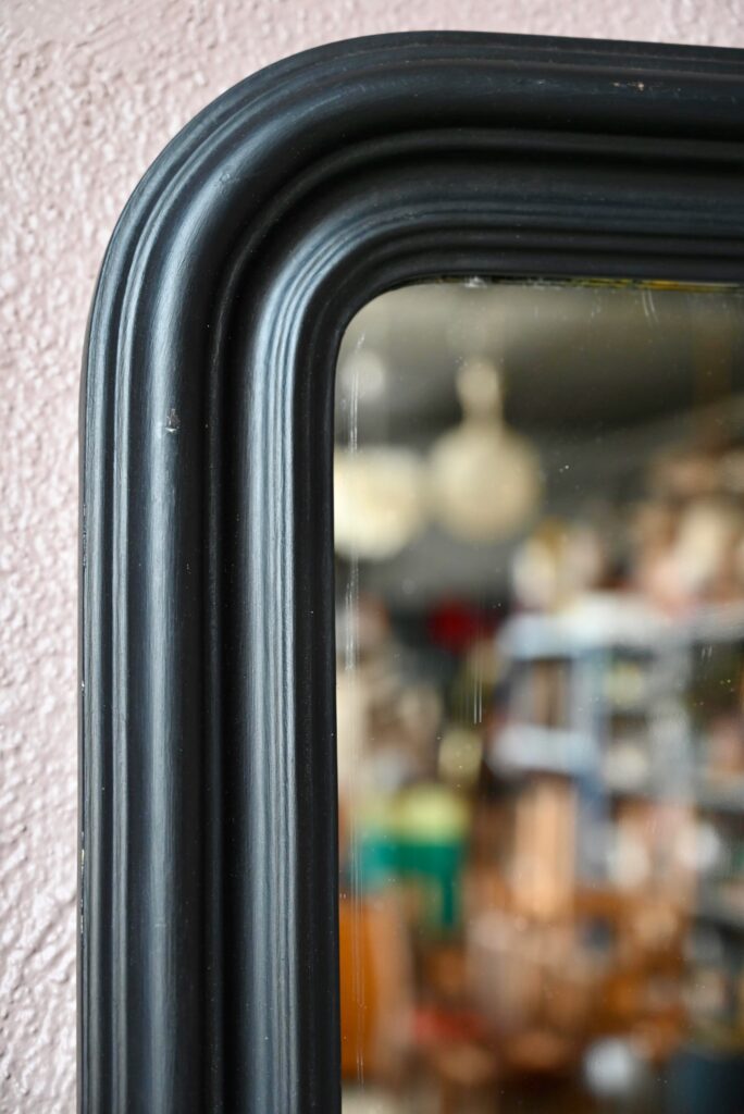 Le miroir Louis Philippe est ancien. Il est de belles dimensions. Il est en bois peint en noir mat, quelques traces d’usage sont visibles sur la peinture, notamment une ancienne couleur jaune.