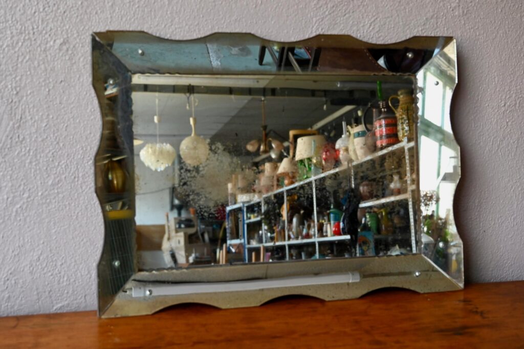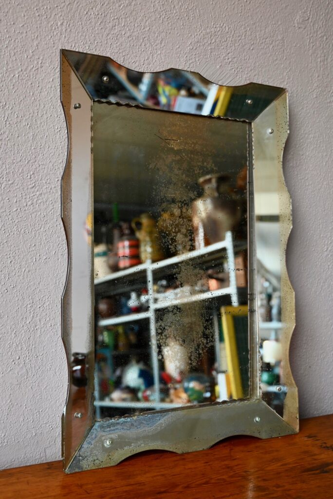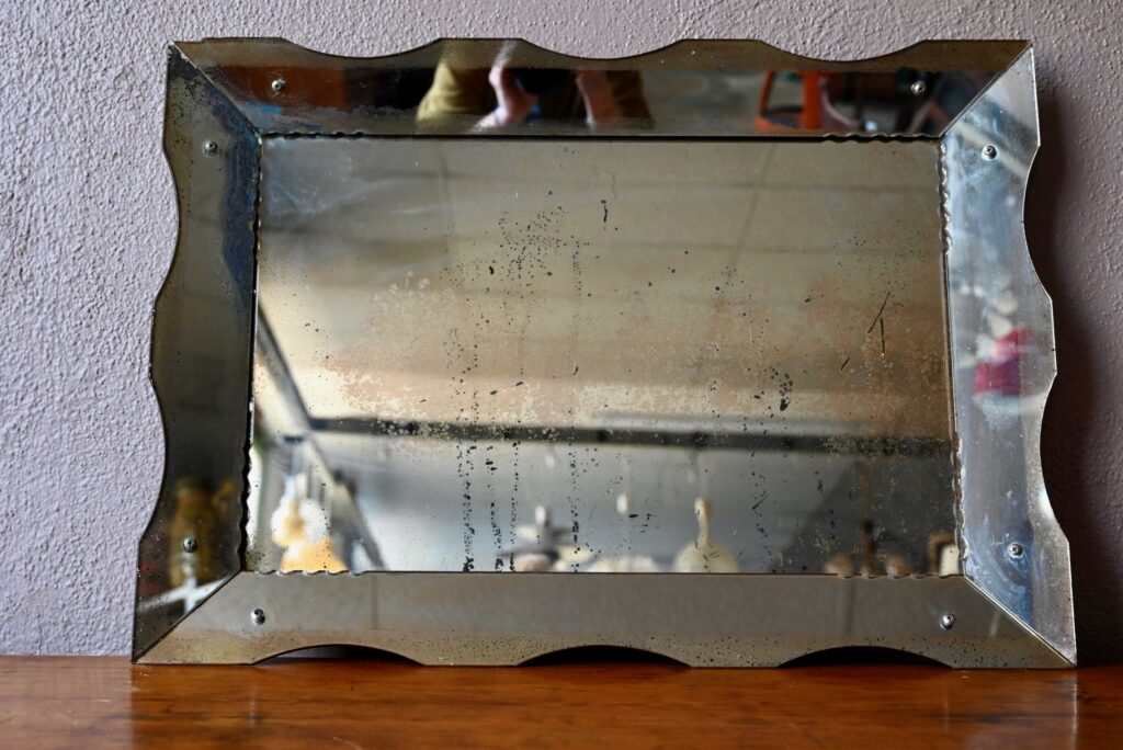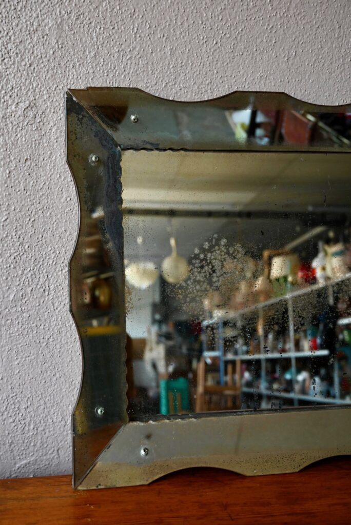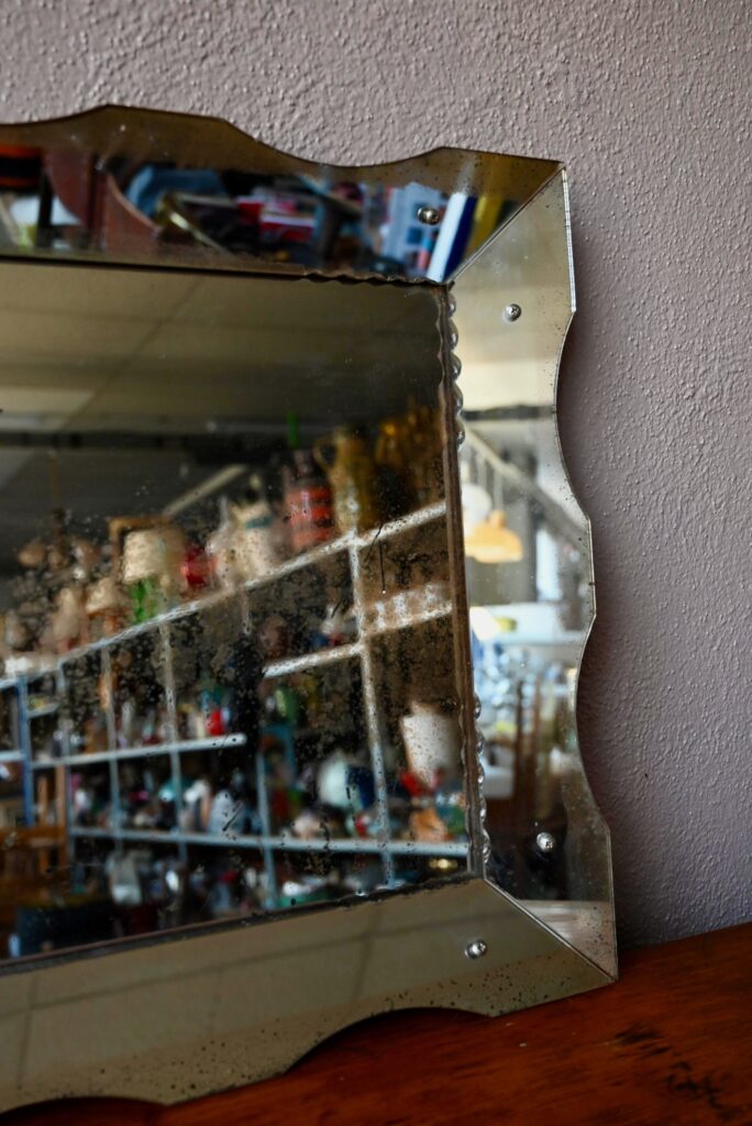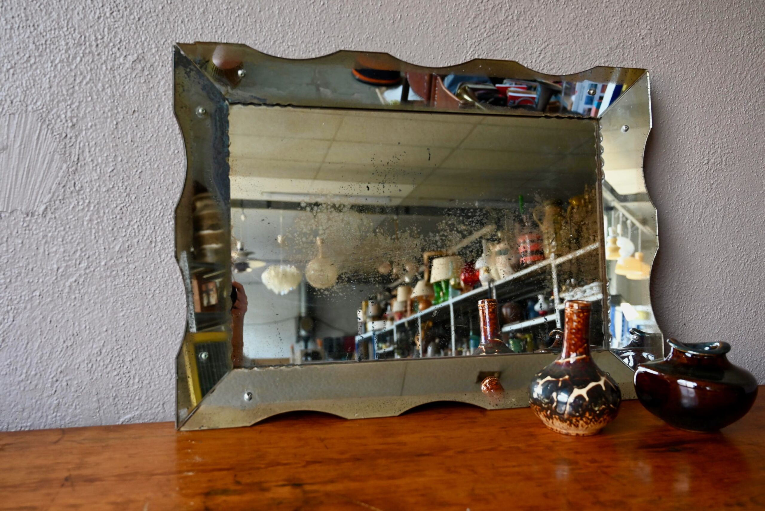 Le miroir peut se poser ou se fixer au mur (crochet à prévoir). Il présente un superbe cadre également en glace biseautée. Il y a un manque de verre dans un coin du cadre, visible en photo. Le tain est très piqué par endroit et ajoute au charme de la pièce.