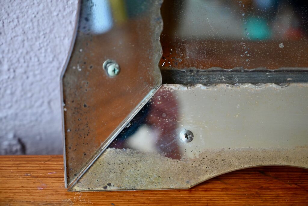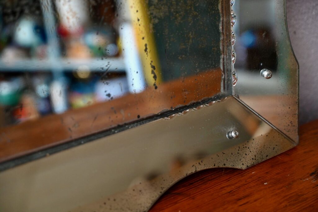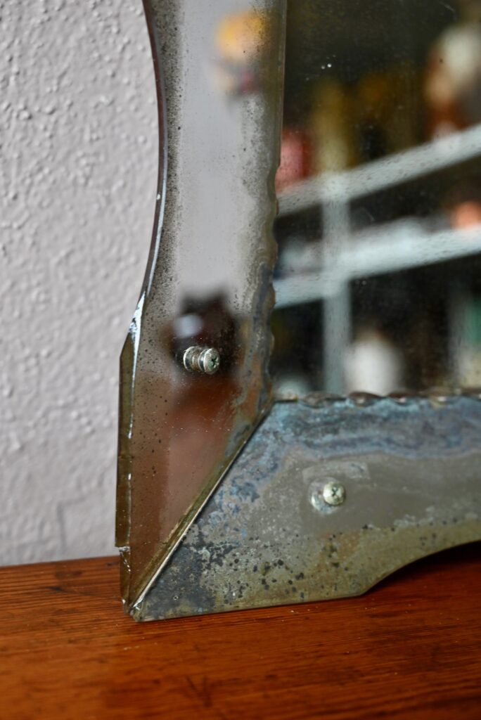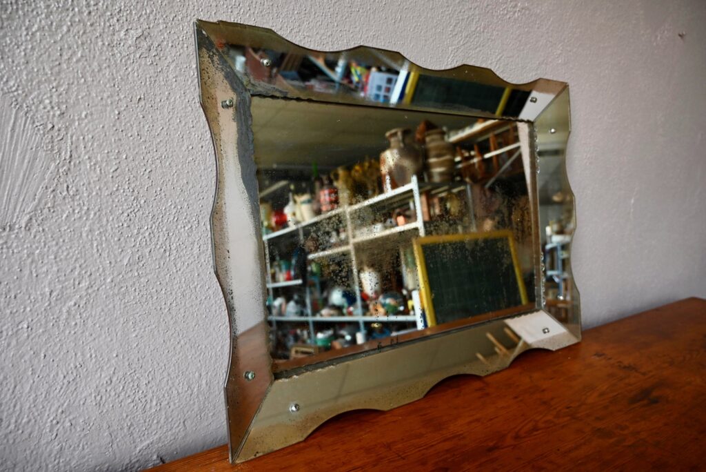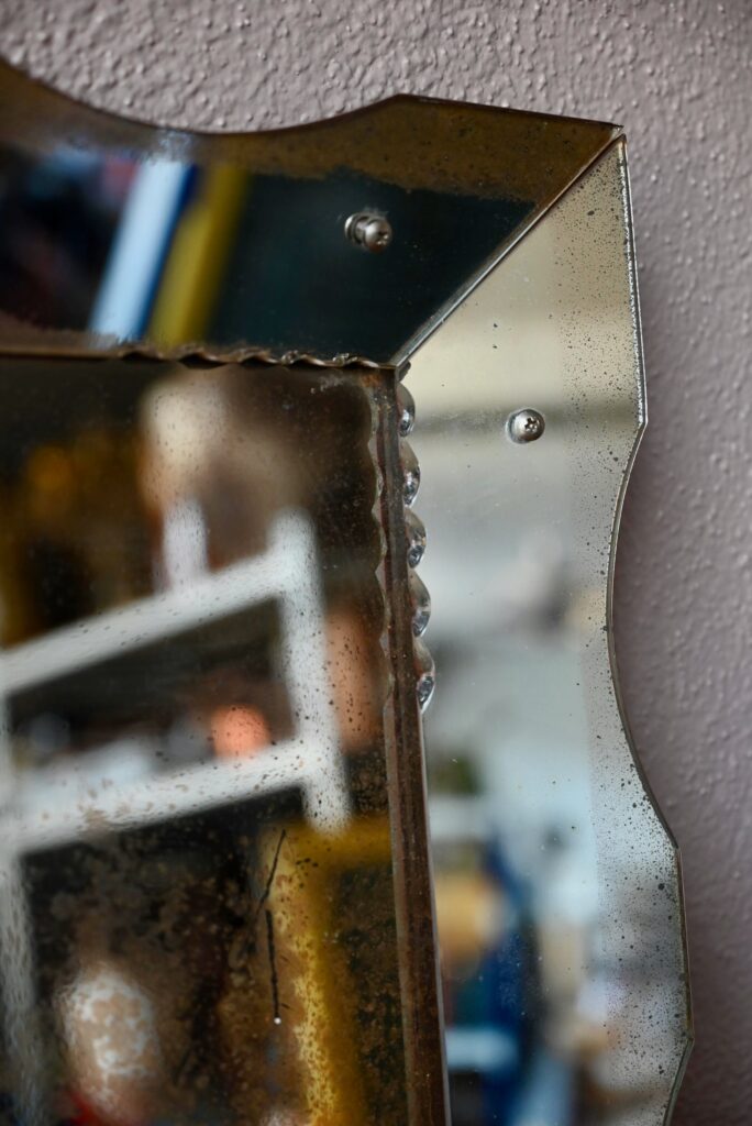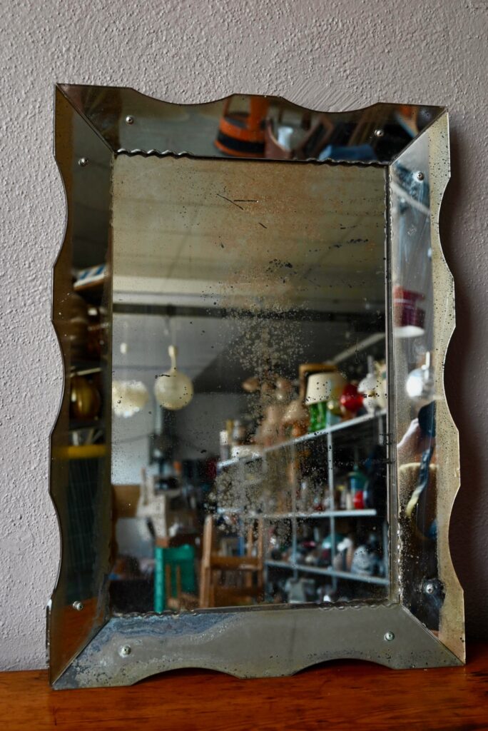 Le miroir peut se poser ou se fixer au mur (crochet à prévoir). Il présente un superbe cadre également en glace biseautée. Il y a un manque de verre dans un coin du cadre, visible en photo. Le tain est très piqué par endroit et ajoute au charme de la pièce.