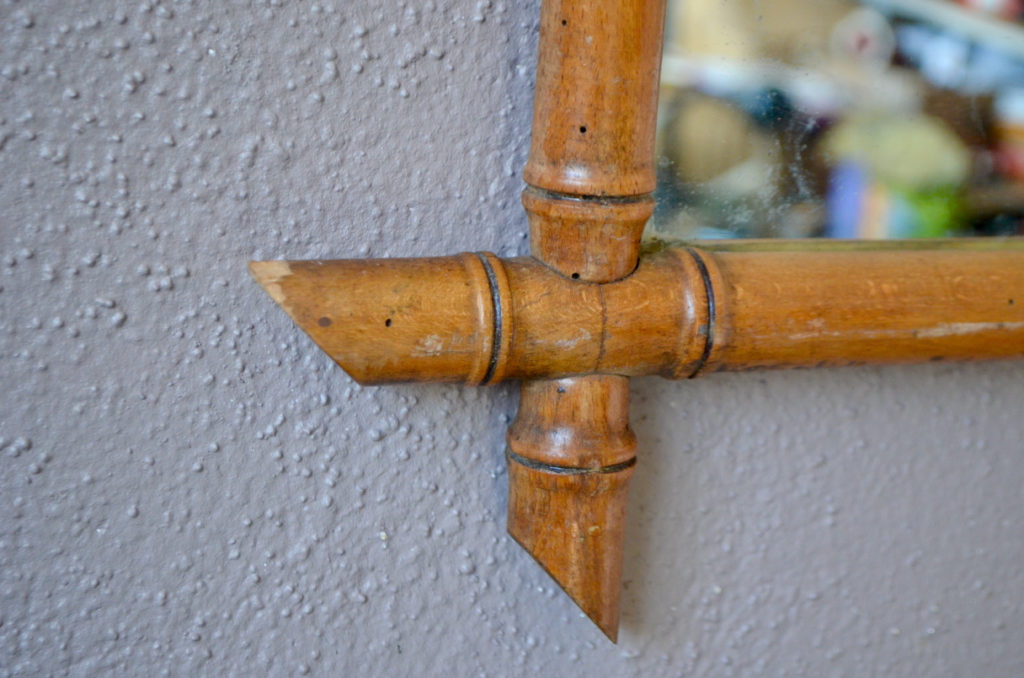 Jolie production des années 1930, ce miroir est somptueux. Le cadre est en bois tourné, façon “bambou”. L’artisan qui a réalisé ce travail s’est inspiré du courant orientaliste, très présent dans le mobilier Art Déco à cette période. Il possède une patine profonde qui lui donne beaucoup de cachet. C’est une belle décoration murale à l’esprit bohème.