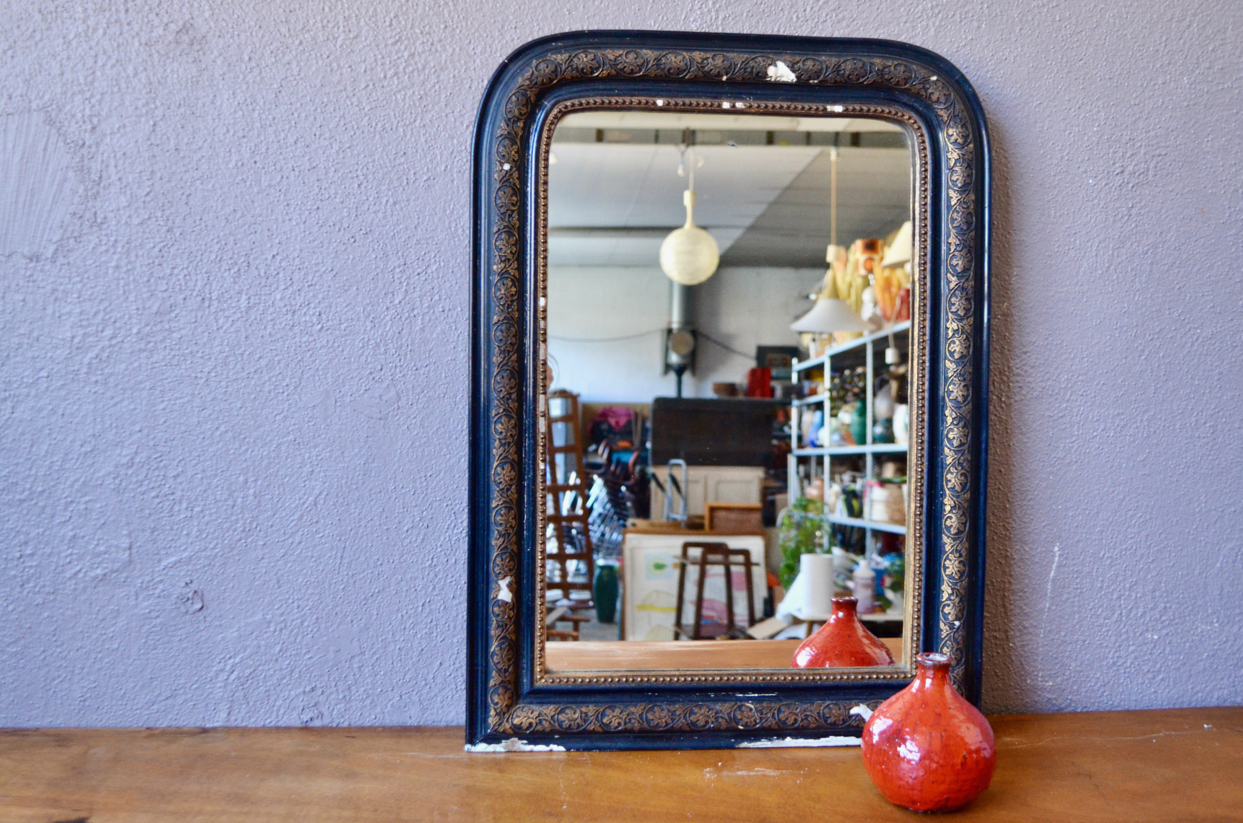Le miroir Louis Philippe date de la fin du 19ème siècle. Il est en bois rehaussé de stuc et présente de jolis contrastes de couleurs : noir ébène et frise de feuilles de chêne dorées. Le tain est en bel état, à peine piqué. Le cadre présente des manques qui participent au charme de la pièce et la rendent unique. Un système de fixation est prévu à l’arrière.
