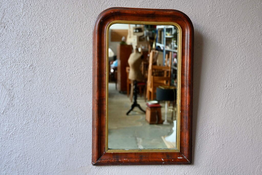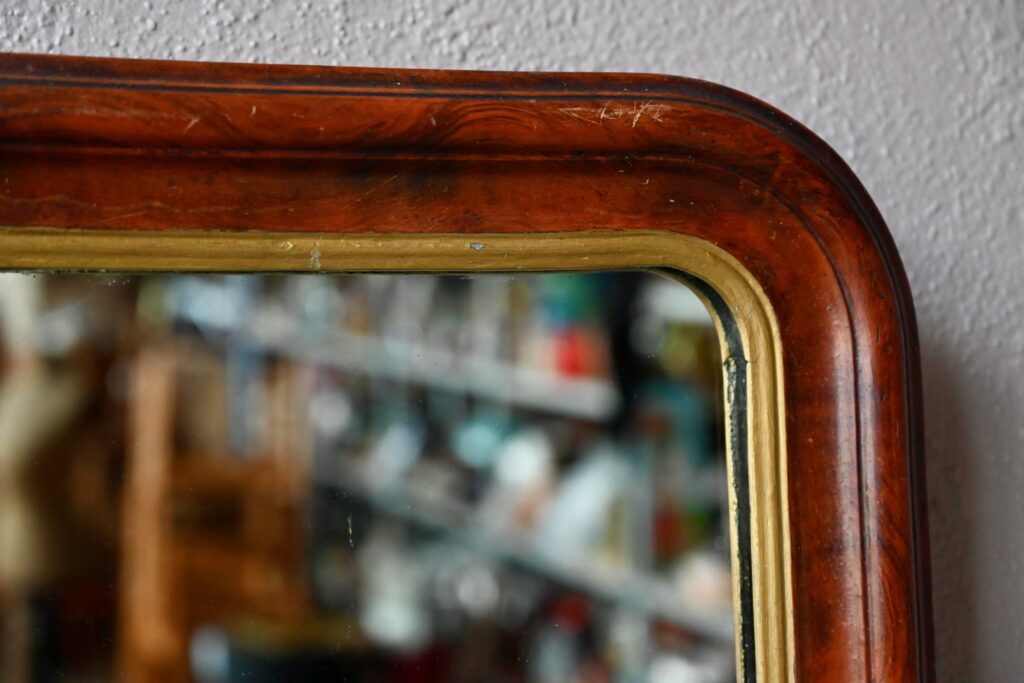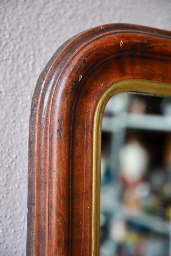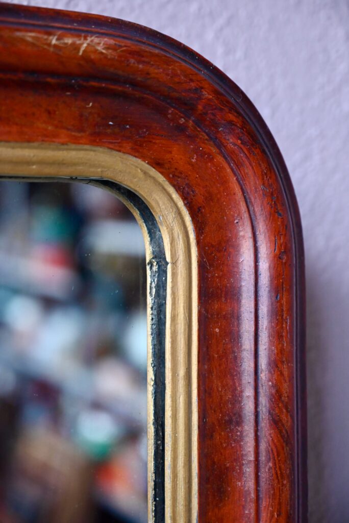 Le miroir Louis Philippe est ancien, il est de belles dimensions. Il est en bois rehaussé de stuc et présente une jolie patine de vie. Son tain est piqué. Quelques traces d’usage sont visibles également sur le cadre.