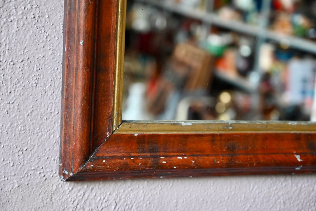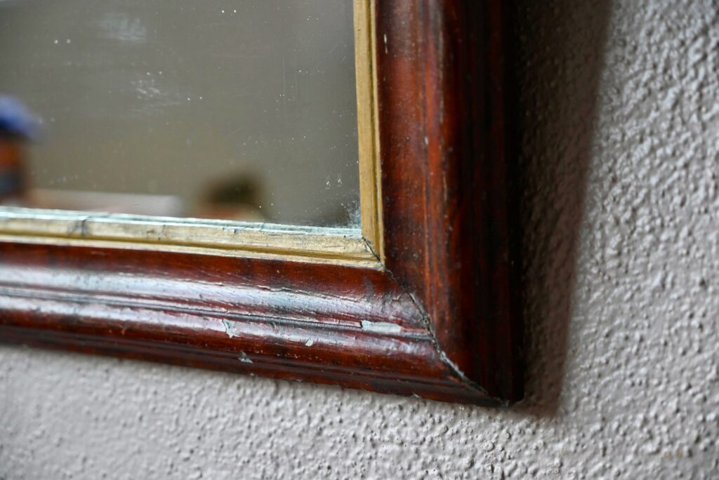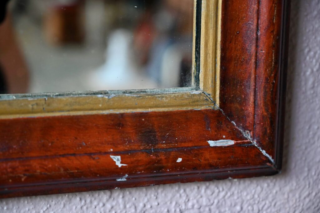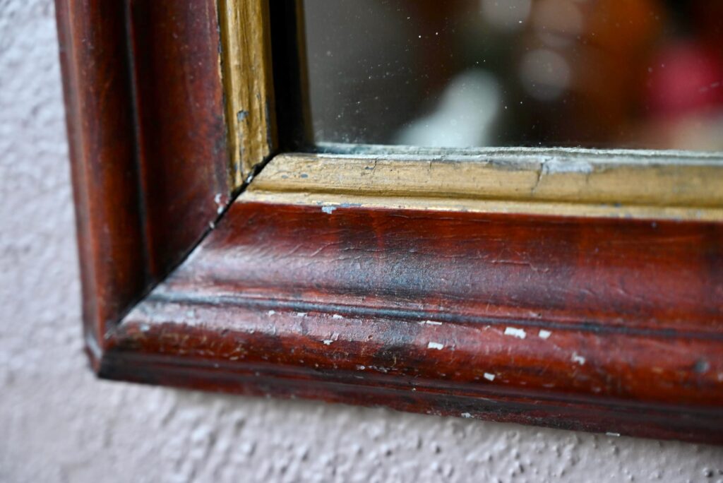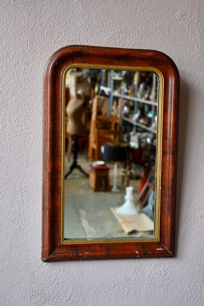 Le miroir Louis Philippe est ancien, il est de belles dimensions. Il est en bois rehaussé de stuc et présente une jolie patine de vie. Son tain est piqué. Quelques traces d’usage sont visibles également sur le cadre.