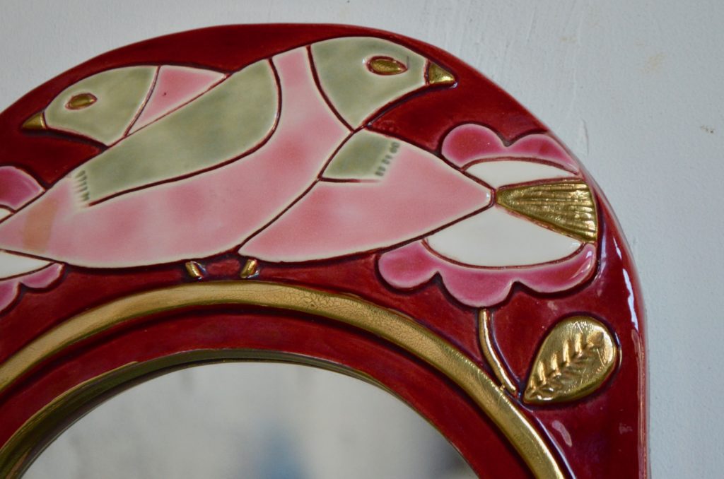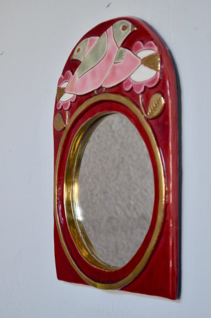 Le miroir est ancien, il date des années 60. Il est en céramique, motifs végétaux et oiseaux stylisés. L’émail dans les tons pourpre, rose tendre, framboise et gris est brillant. Les détails dorés viennent rehausser les couleurs et apporter de la profondeur à la pièce. Un minuscule et très discret manque d’émail est à noter sous le cadre, visible sur une photo. La dorure est un peu moins brillante sur un discret point, au bas du miroir, visible sur une photo, un minuscule saut d’émail est visible sur l’envers du miroir ainsi que sur la tranche inférieure. L’ensemble est en très bel état de conservation, sans fêle, la brillance de l’émail est très belle.