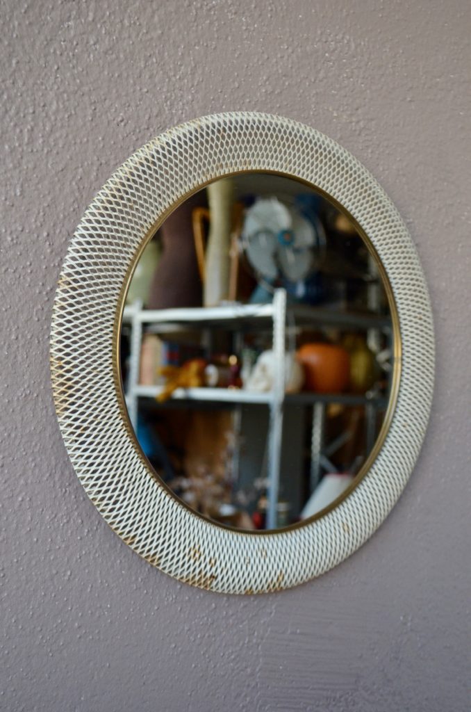 Le cadre du miroir est en métal ajouré blanc. Il est en bel état, quelques traces d’oxydation sont visibles. Un système présent à l’arrière du miroir vintage permet sa suspension.