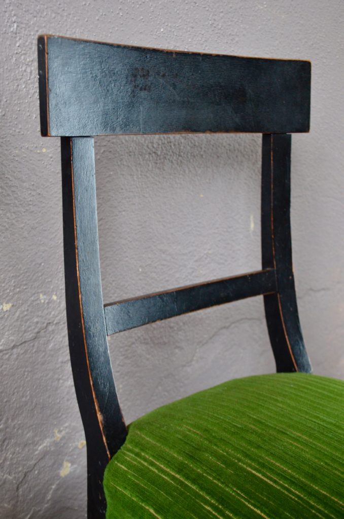 Les chaises sont anciennes, l’assise est tapissée de tissu velours vert, d’origine. Elles sont stables, en bel état. La structure est en bois noirci, légèrement patiné aux points de frottement. Nous apprécions le velours de l’assise et leur touchante simplicité.