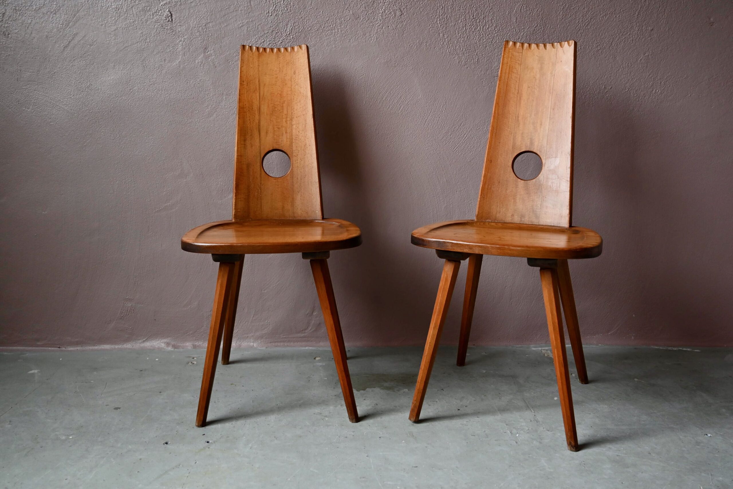 Les chaises sont en bois massif. D’aspect brut, massif, elles dégagent force et présence. Les dossiers sont très originaux. Quelques traces d’usage sont visibles sur les assises.