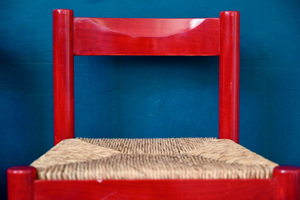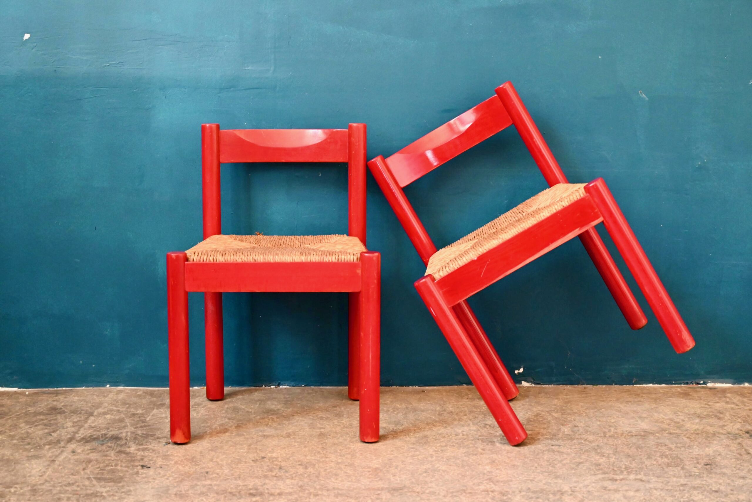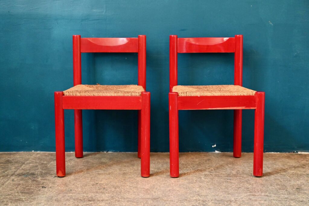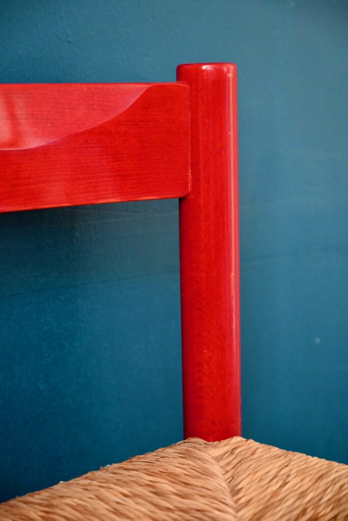 Élégantes et modernes, cette paire de chaises des années 70 est lumineuse et originale. Design midcentury italien, les lignes sont tranchées et l’alliance des matériaux audacieuse. L’assise en paille est accueillante. En bois massif, la structure de ces chaises est teinté rouge vif, mettant en avant le dessin du dossier et son dossier anguleux. A mi-chemin entre le design rationnel radical et les productions de mobilier traditionnel, ces chaises rouges possèdent un caractère unique et ancré dans l’air du temps.