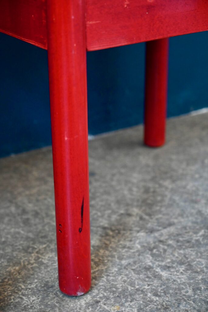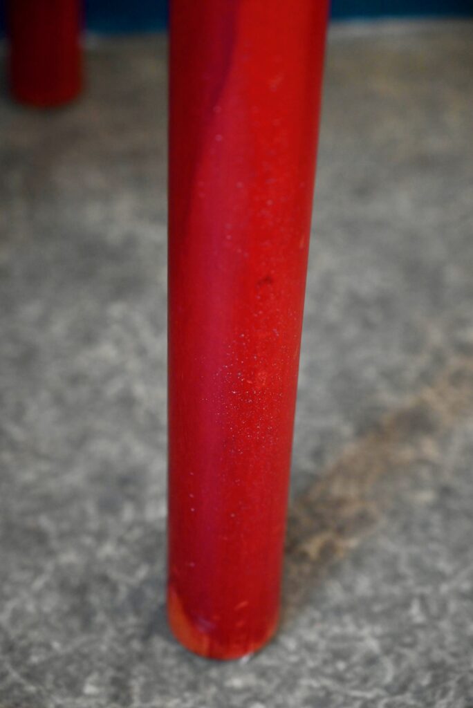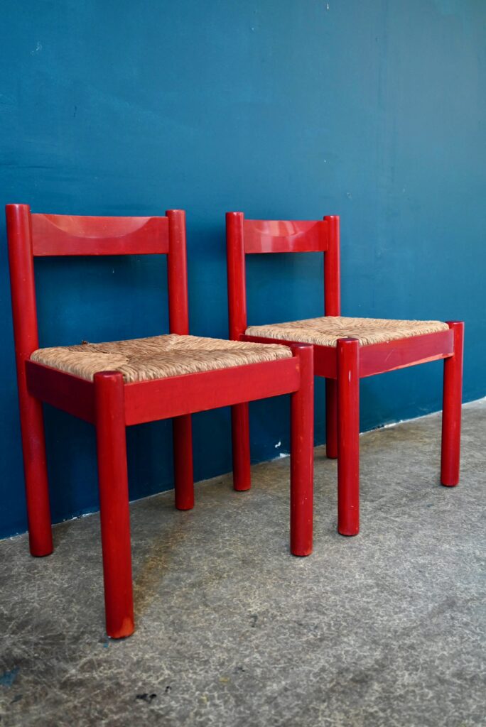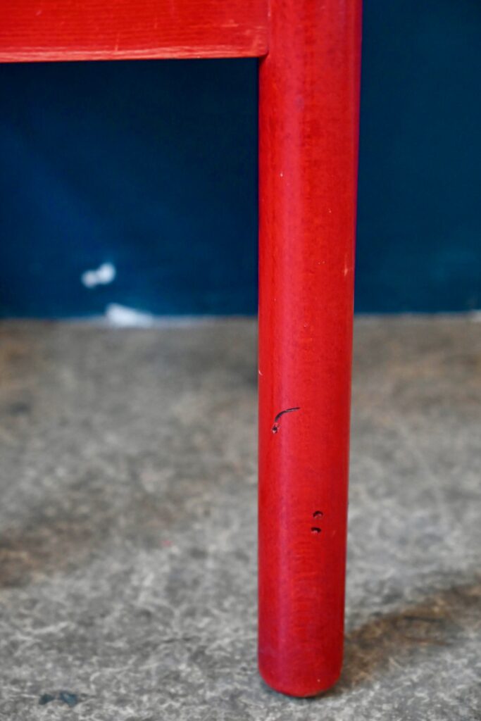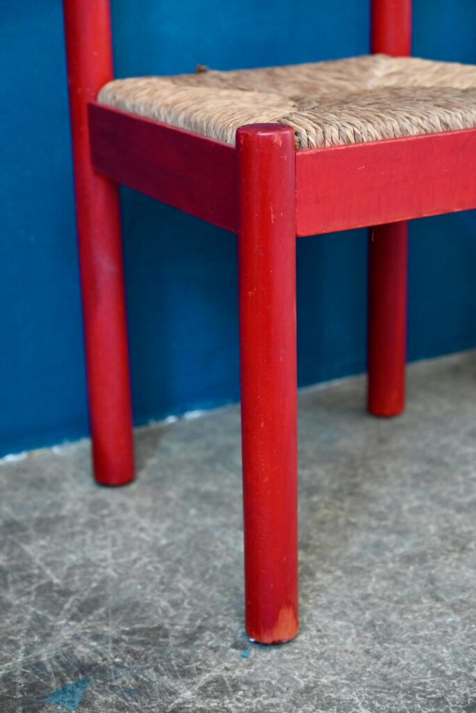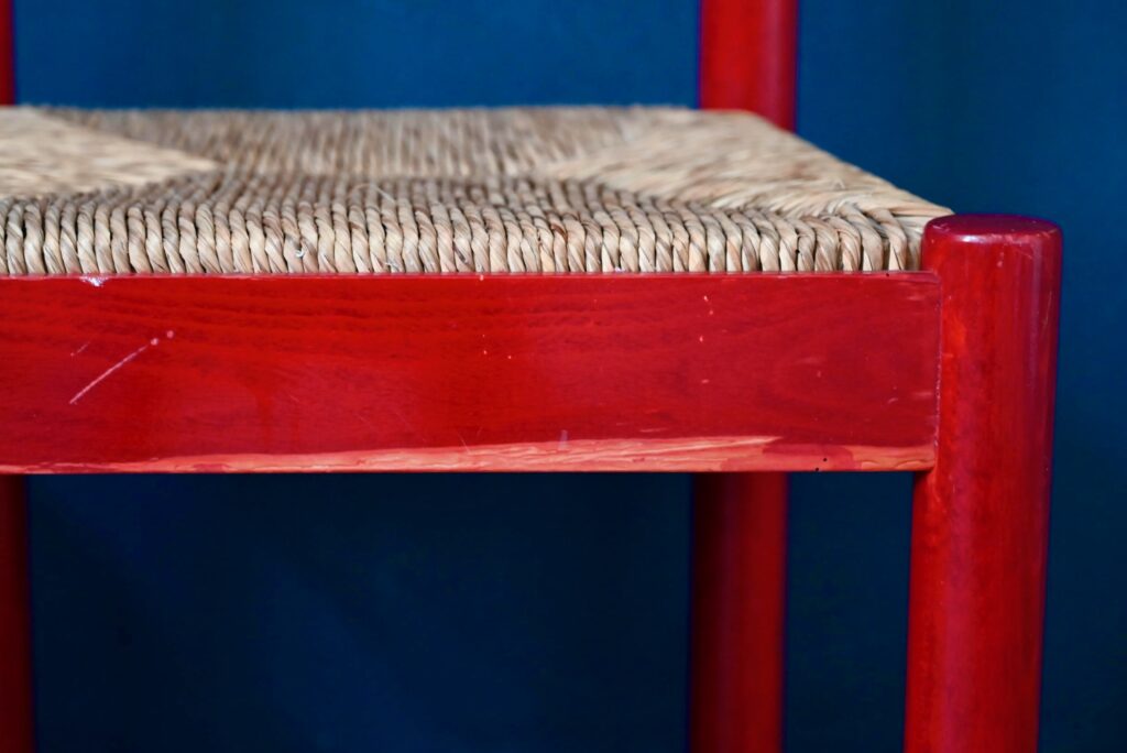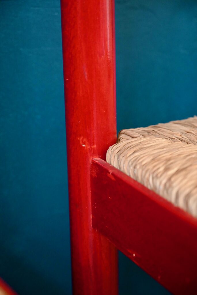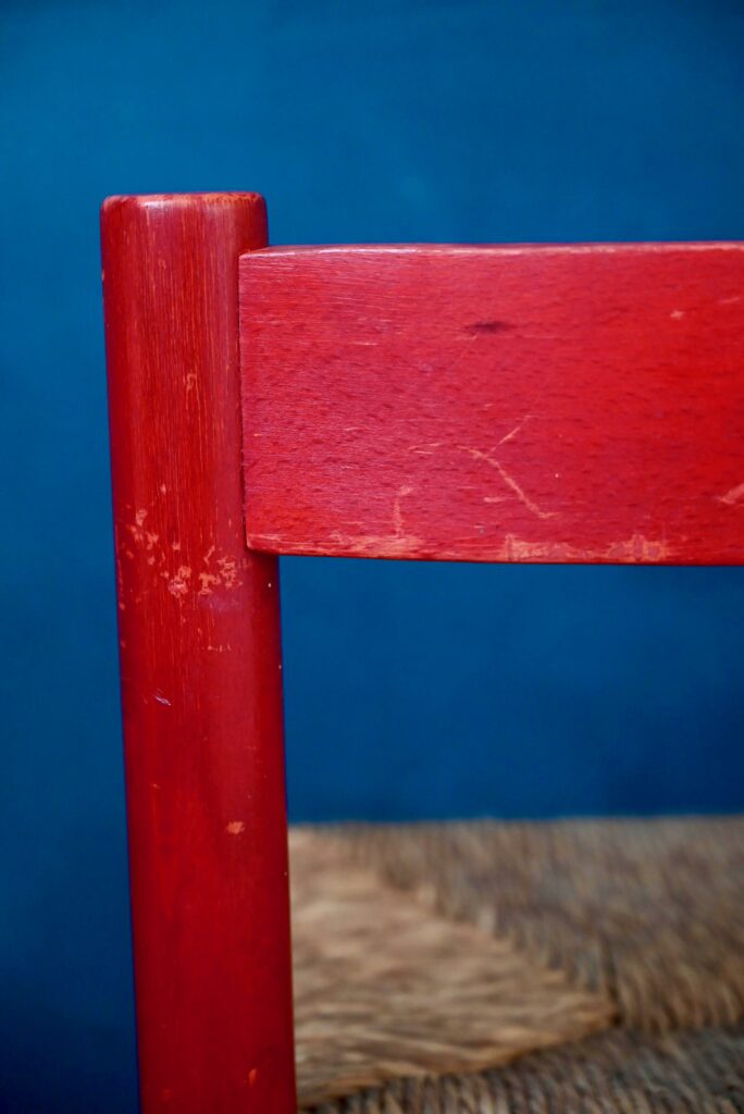 Les chaises datent des années 60. Elles sont en bel état et de belle facture. La structure est en hêtre massif est teintée rouge vif, une décoloration est visible à l’avant ainsi que des traces d’usage. Les assises sont en paille tressée. Un accroc est à noter mais elles sont en bel état. Les chaises sont stables, très confortables et élégantes. Les traces d’usage sont légères. Des trous de ver sur l’envers et un pied sont à noter, les chaises ont été nettoyées et traitées. Le prix est pour la paire.