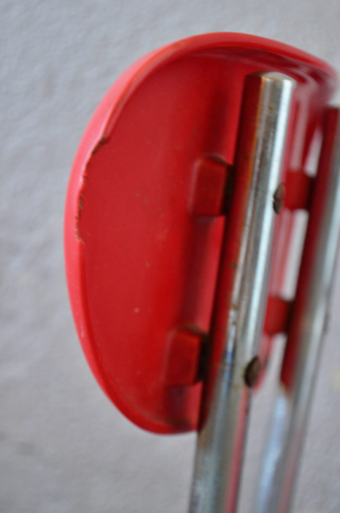 Attention! Ces chaises pop et vintage sont un véritable cocktail d’énergie. Leur structure est en tube d’acier chromé, les pièces formant assise et dossier sont en plastique moulé profondément rouge. D’allure volontaire, colorées et joyeusement pop, ces deux chaises au design terriblement vintage feront mouche dans une jolie cuisine. De faible encombrement, elles pourront également se mettre au travail et devenir de charmantes chaises de bureau.