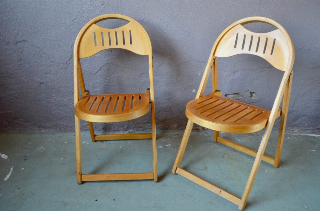 Dans l’esprit des productions Bauhaus, cette paire de chaises pliantes possède un design audacieux et minimaliste. Réalisées en bois contrecollé et cintré, elles possèdent des dossiers et assises ajourés, allégeant le trait pour un aspect plus aérien. Pratiques et fonctionnelles, les chaises sont pliables et dotées d’une poignée afin d’en faciliter la manipulation. Chaises d’appoint par excellence, elles sauront se rendre indispensables lors des dîners improvisés entre amis ou en famille.