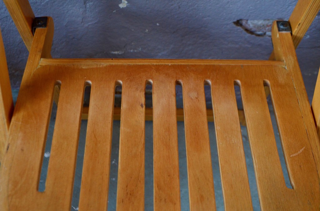 Les chaises sont en bois massif et contreplaqué. De teinte claire, elles sont parfaitement fonctionnelles, elles présentent des traces légères d’utilisation.
