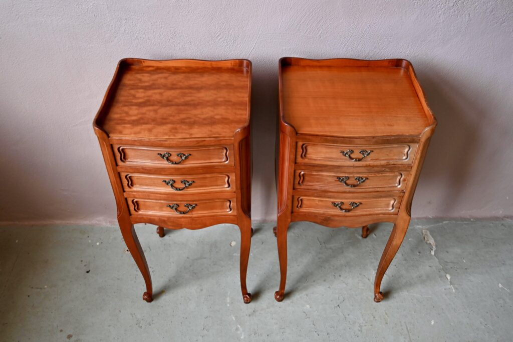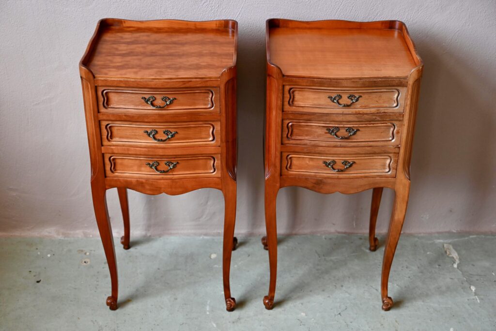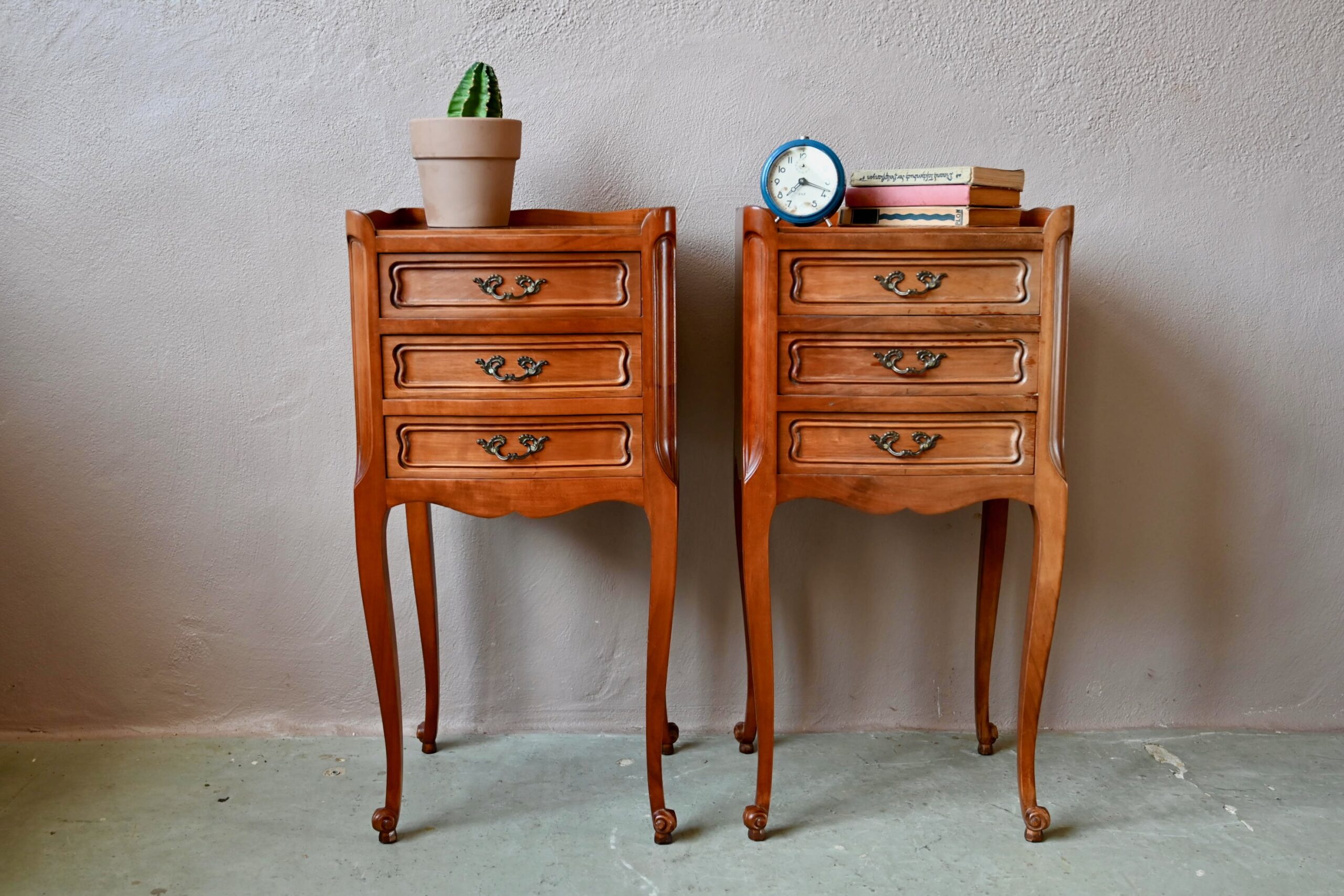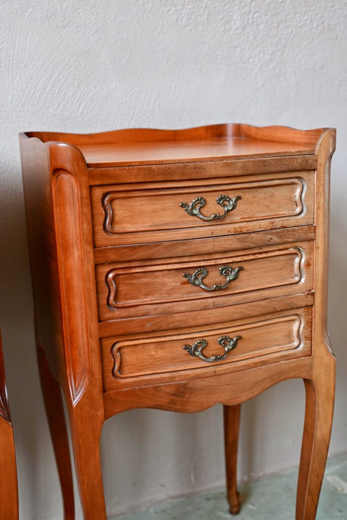 Les tables de nuit peuvent également être utilisées en mini-commodes, sellettes, bouts de canapé. Elles sont de belle facture. Un des chevets présente une légère décoloration, visible en photo. Le bois est ciré, des petites traces d’usage sont visibles en photo.