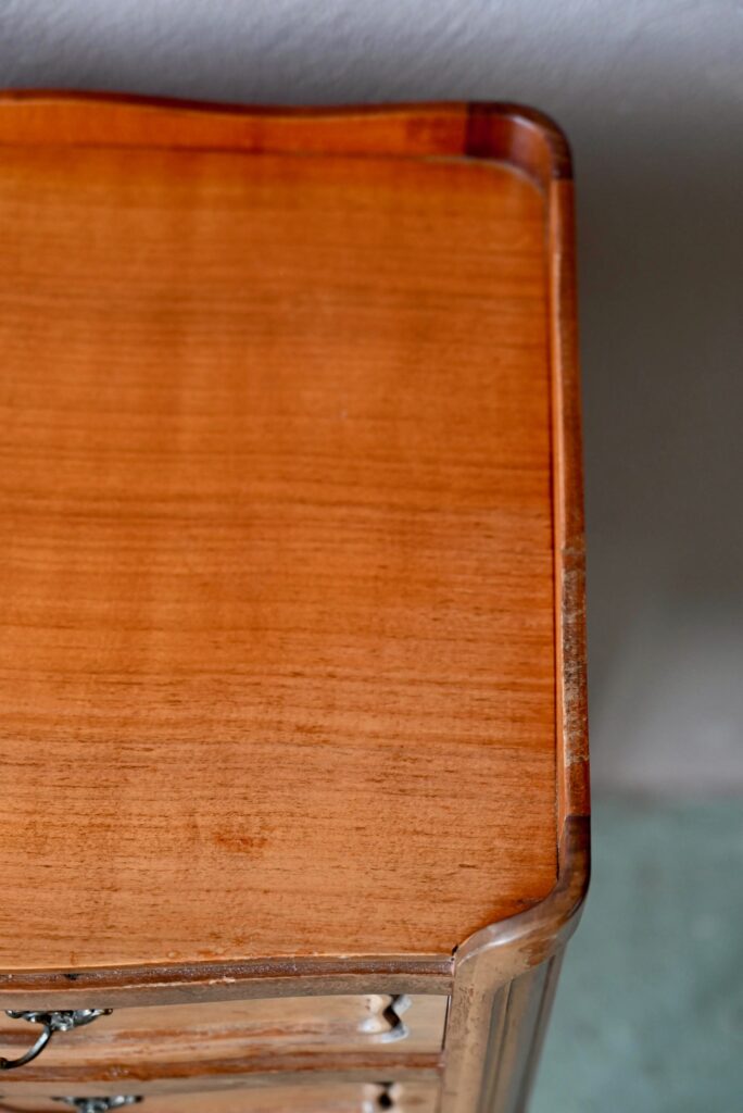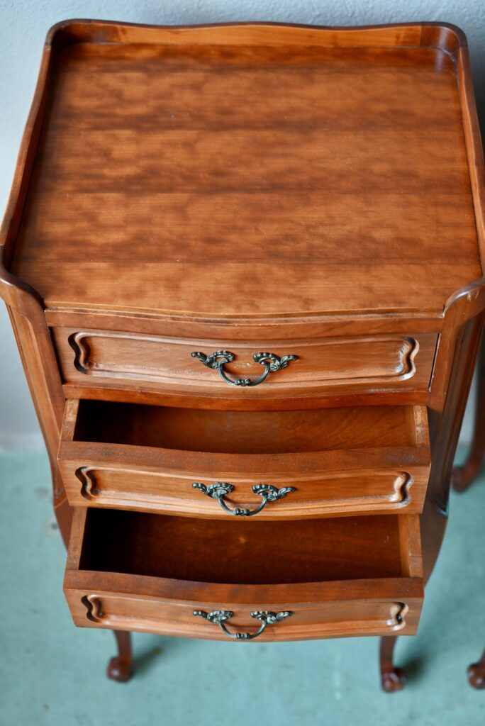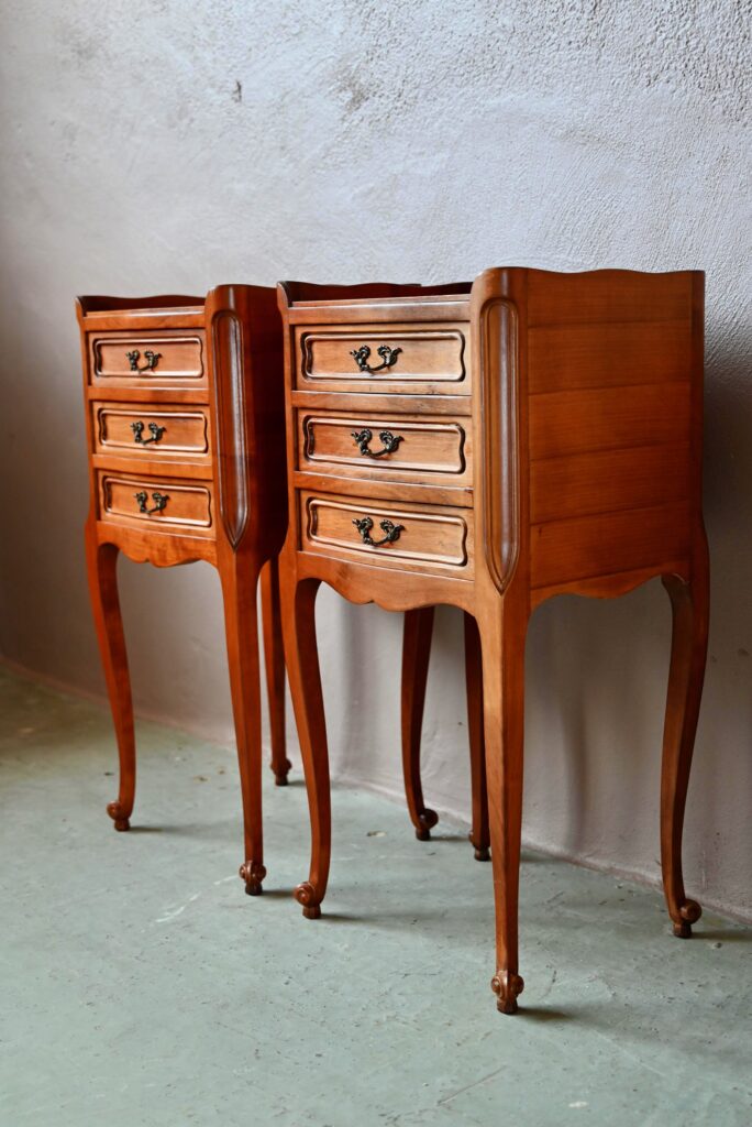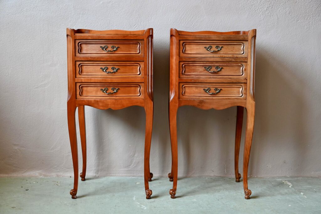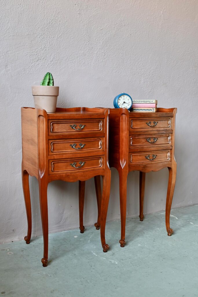 Les tables de nuit peuvent également être utilisées en mini-commodes, sellettes, bouts de canapé. Elles sont de belle facture. Un des chevets présente une légère décoloration, visible en photo. Le bois est ciré, des petites traces d’usage sont visibles en photo.