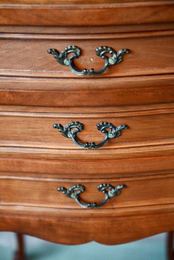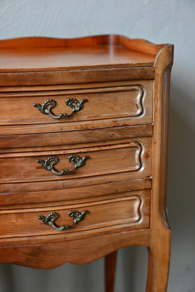 Ces chevets en bois sculpté de style Louis XVI sont de petits meubles d’appoint attachants. On les imagine de l’entrée au salon, de la chambre à la salle d’eau. Les dimensions compactes et pratiques, et la silhouette sobre les destinent à tous les usages. Les lignes sont élégantes, galbées et élancées. Ils comportent 3 fins tiroirs dotés de boutons de laiton travaillé… et un joli détail sculpté au niveau des pieds!