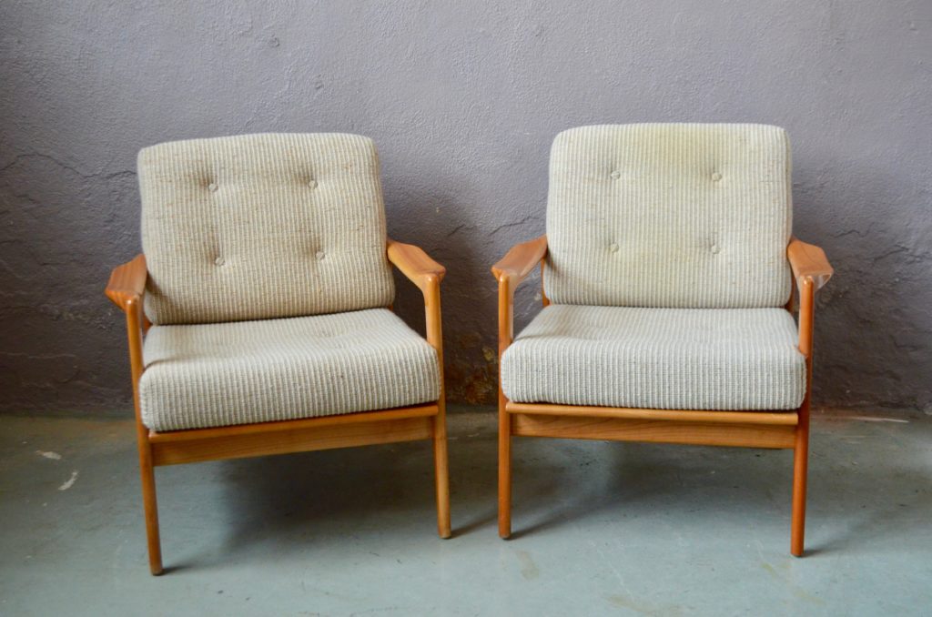 Les fauteuils datent des années 60 et affichent de belles lignes scandinaves. En bois blond, la structure est lumineuse et élégante. Assise et dossier sont moelleux et confortables. Le lainage écru est d’origine, de belle qualité et en bel état. Un des coussins présente une légère décoloration, visible sur les photos. Le prix comprend la paire de fauteuils.