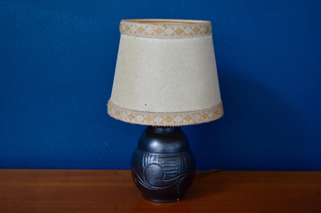 Ce duo de lampes à poser date des années 1930 et est une production française qui se mettra au service d’une ambiance feutrée et chaleureuse. Le pied des lampes, de forme oblongue, est réalisé en céramique noire, décorée de motifs géométrique abstraits. Les lampes sont d’allure sobre et élégante, pleine de classe. Les motifs ornementaux en léger relief sur les pieds sont particulièrement raffinés et intéressants.