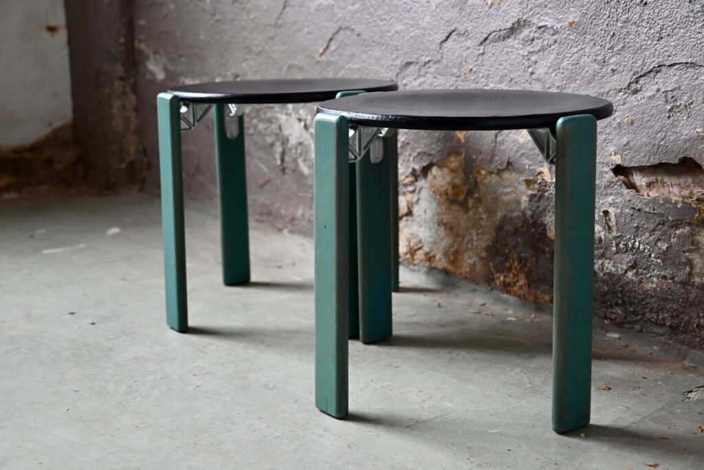 Bruno Rey est un designer suisse dont le trait minimaliste est tourné vers la fonction. Pour ses sièges fabriqués par Dietiker, il met au point un ingénieux système de fixation entre le piétement et les galettes d’assise. Il en résulte des chaises et tabourets empilables, au design original et quelque peu futuriste. Ainsi, l’assise de ces tabourets est comme suspendue et décalée par rapport au piétement. Les tabourets sont bicolores, en bois peint en vert léger et noir profond.