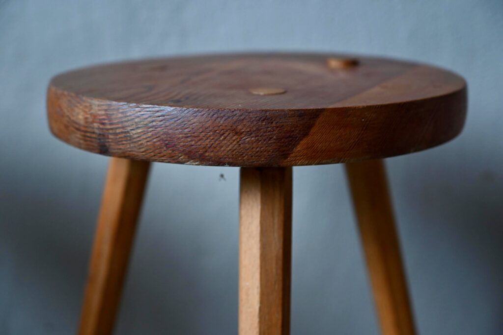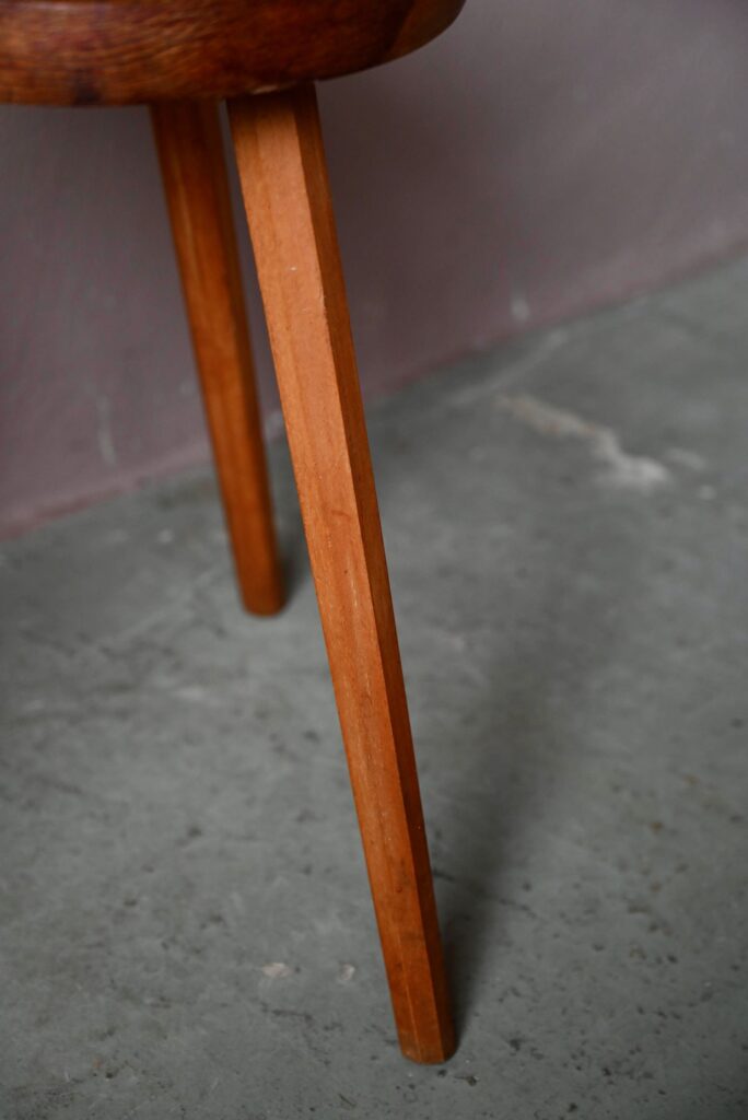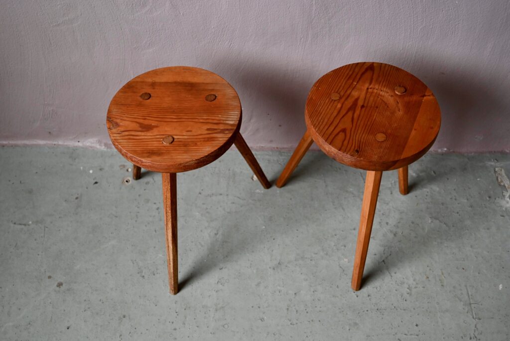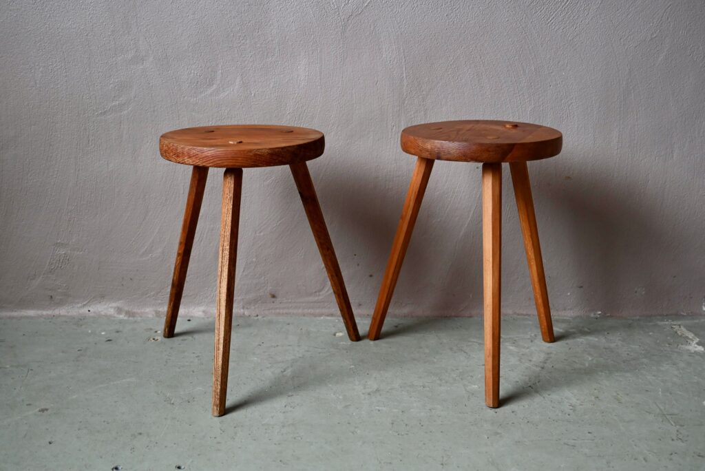 Les tabourets sont en bois massif de teinte miel. La taille les destinent aussi bien à un usage d’assises que de sellettes porte-plantes. Montés sur un piétement tripode, les lignes sont brutes et rustiques. Le bois est joliment marqué par les années, il est sain. Des traces d’usage sont présentes et visibles en photo. Le prix est pour la paire
