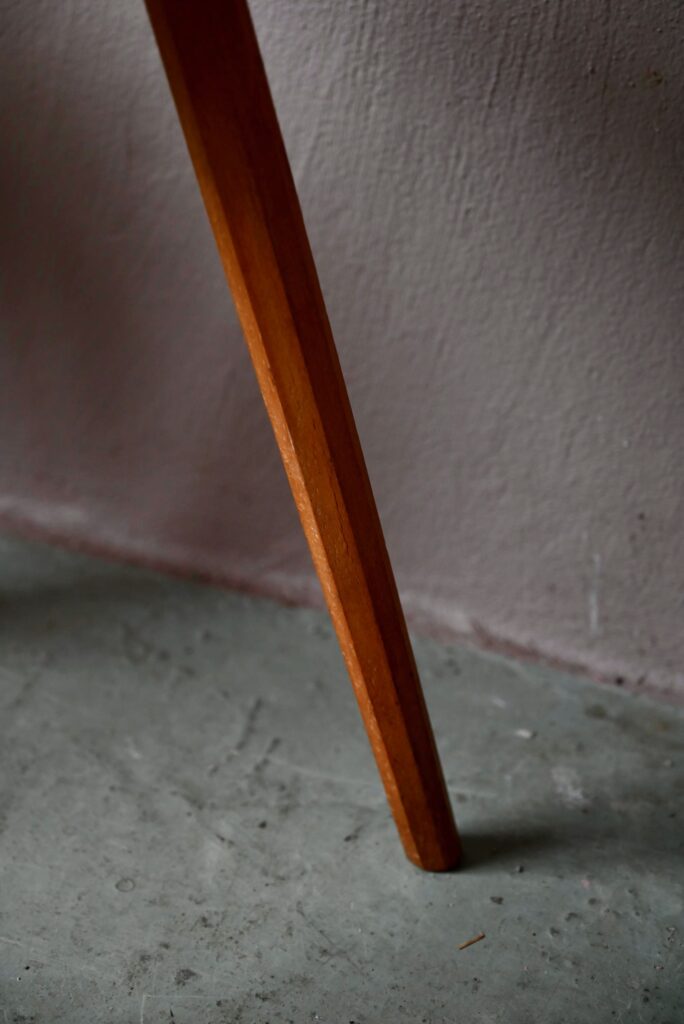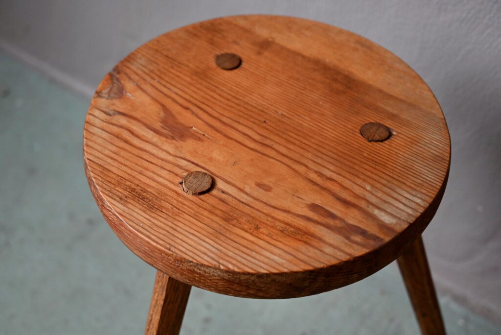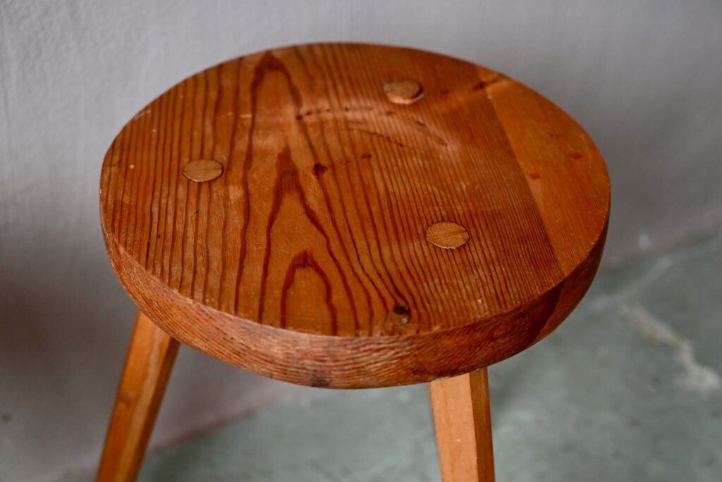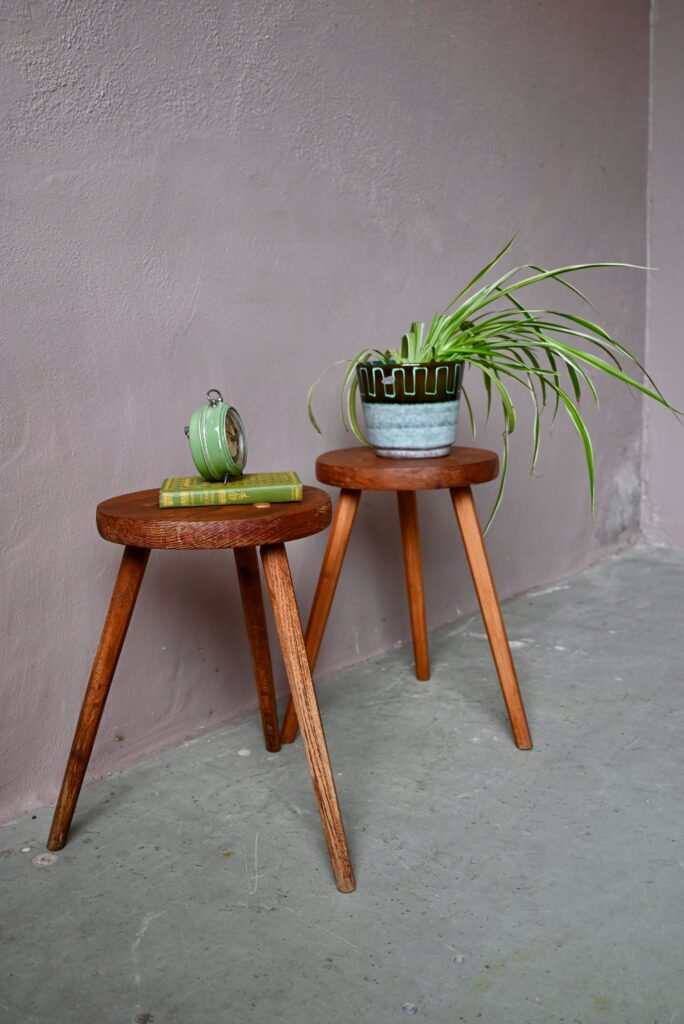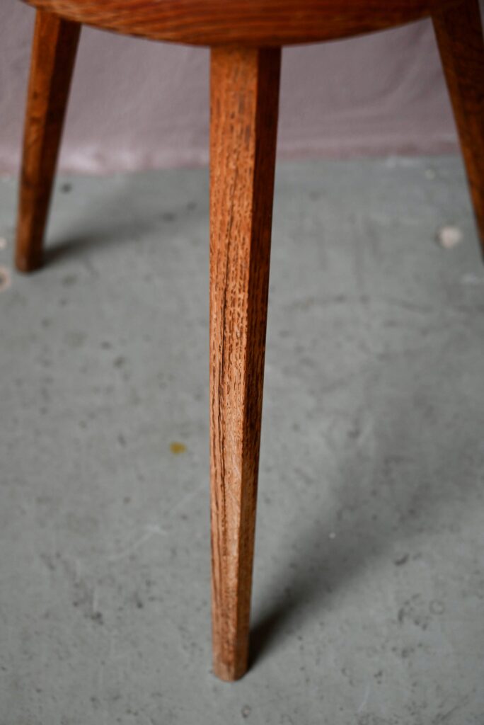 Les tabourets sont en bois massif de teinte miel. La taille les destinent aussi bien à un usage d’assises que de sellettes porte-plantes. Montés sur un piétement tripode, les lignes sont brutes et rustiques. Le bois est joliment marqué par les années, il est sain. Des traces d’usage sont présentes et visibles en photo. Le prix est pour la paire