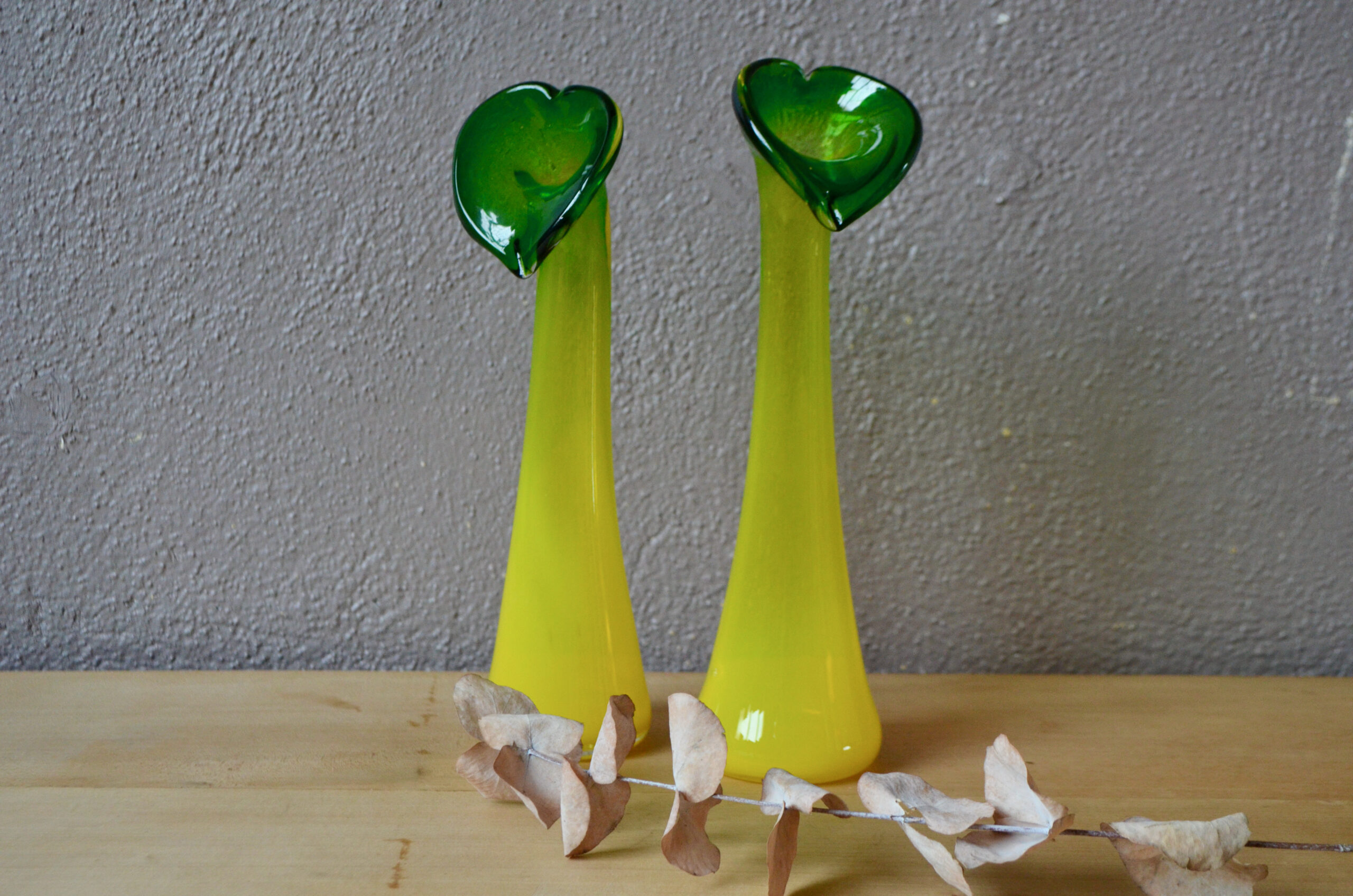 D’inspiration naturaliste, cette jolie paire de soliflores est réalisée en pâte de verre colorée. Forme élancée et organique, terminée par une élégante corolle, ce sont deux pièces décoratives et marquantes. De belle facture, les vases nous offrent des couleurs et nuances du verre étonnantes.