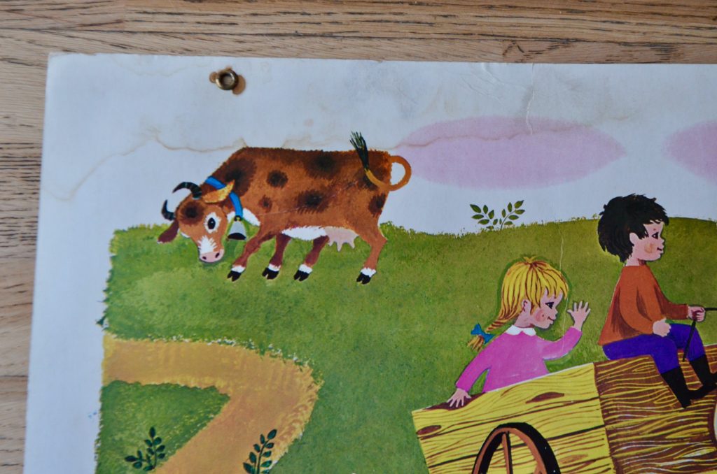 Cette affiche ancienne représente un pécheur et deux jeunes enfants dans une charrette tirée par un cheval. Dans un registre de couleurs douces, proche des illustrations des livres d’enfants, elle a été utilisée dans une école. Les rétro-projecteurs, puis les tablettes les ont remplacées au fil des décennies, mais la mémoire collective garde en tête l’image de l’instituteur en tablier gris, perché sur son estrade, une baguette en bois pointée vers ces affiches d’école… Figurant des scènes de vie, des planches de biologie animale ou végétale ou retraçant l’histoire de France, ces panneaux des années 60 permettaient d’illustrer les cours aux bambins. Aujourd’hui, pas question de colle surprise, ni de leçon d’élocution, on savourera simplement la douceur des images, les couleurs pétillantes et la nostalgie d’une époque… et parfois sa cocasserie aussi! Les illustrations des affiches Fernand Nathan sont très douces, elles s’inscrivent dans un univers coloré, joyeux et enfantin
