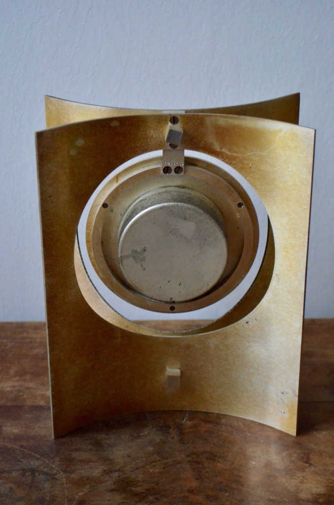 Hour Lavigne est une fabrique française de montres et horloges réputée. Cet atelier est à la frontière entre l’art et l’artisanat. Hour Lavigne fabrique les mécanismes horlogers mais procède également à l’habillage de ceux-ci. Cette horloge ancienne possède un design épuré, organisé autour de formes géométriques évidées. Le cadran et le mécanisme sont suspendus par deux lames de métal incurvées. Il pivote autour d’un axe.