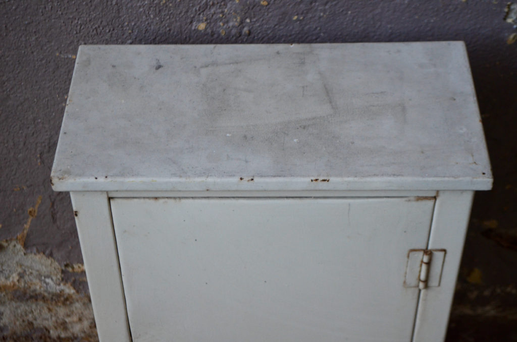 Voici un bien joli meuble de pharmacie au charme rétro et indus certain. Entièrement en métal blanc très patiné et de dimensions généreuses, l’armoire offre un espace de rangement bien pratique. Du vintage fonctionnel comme on aime!