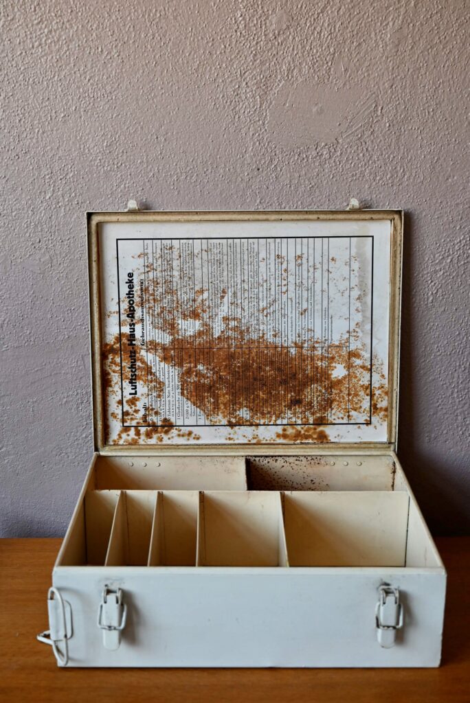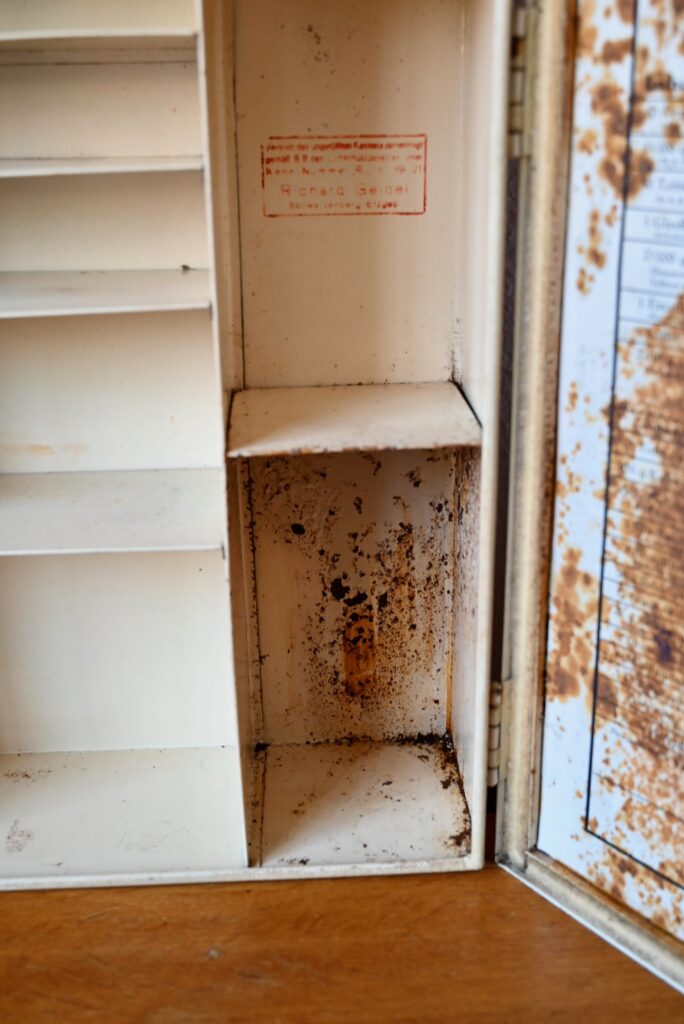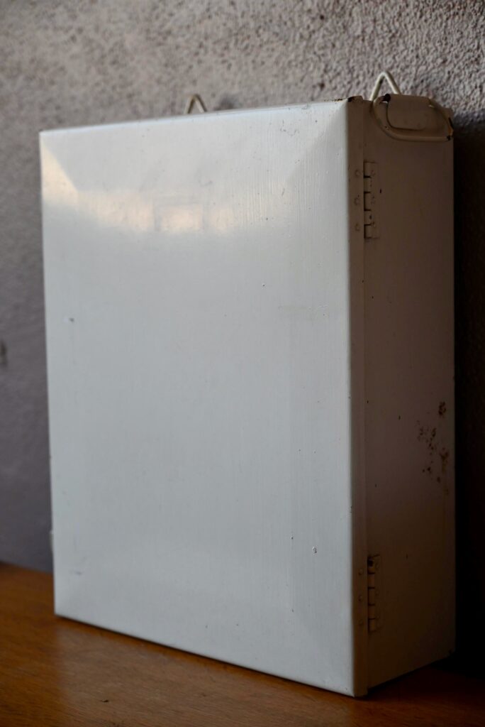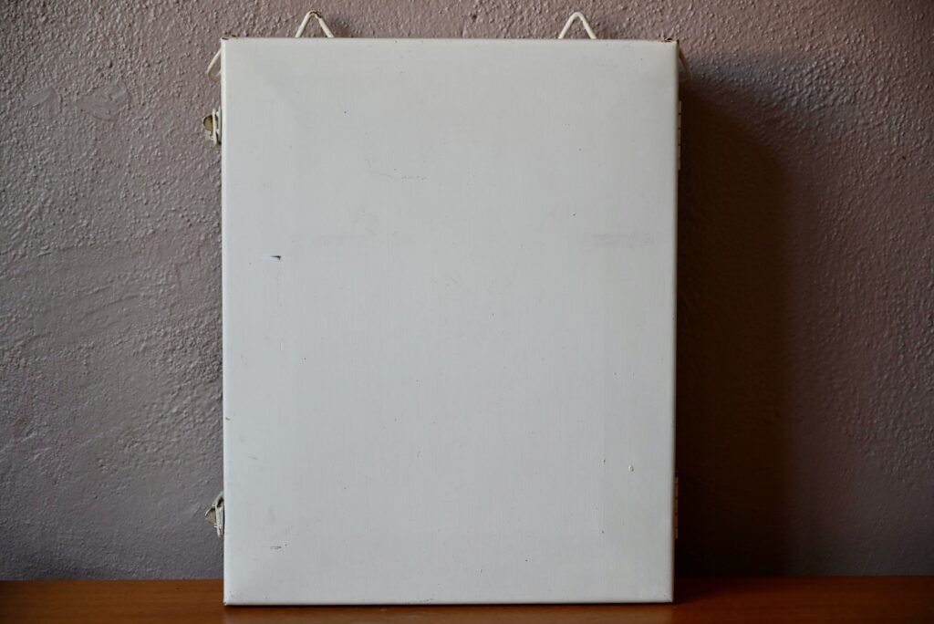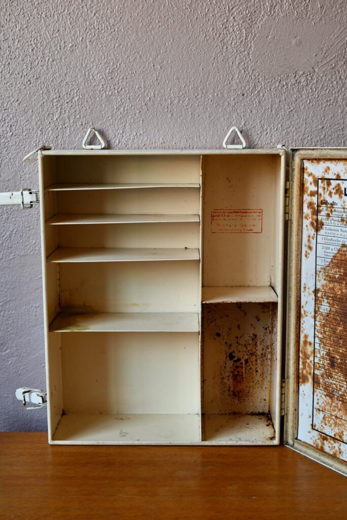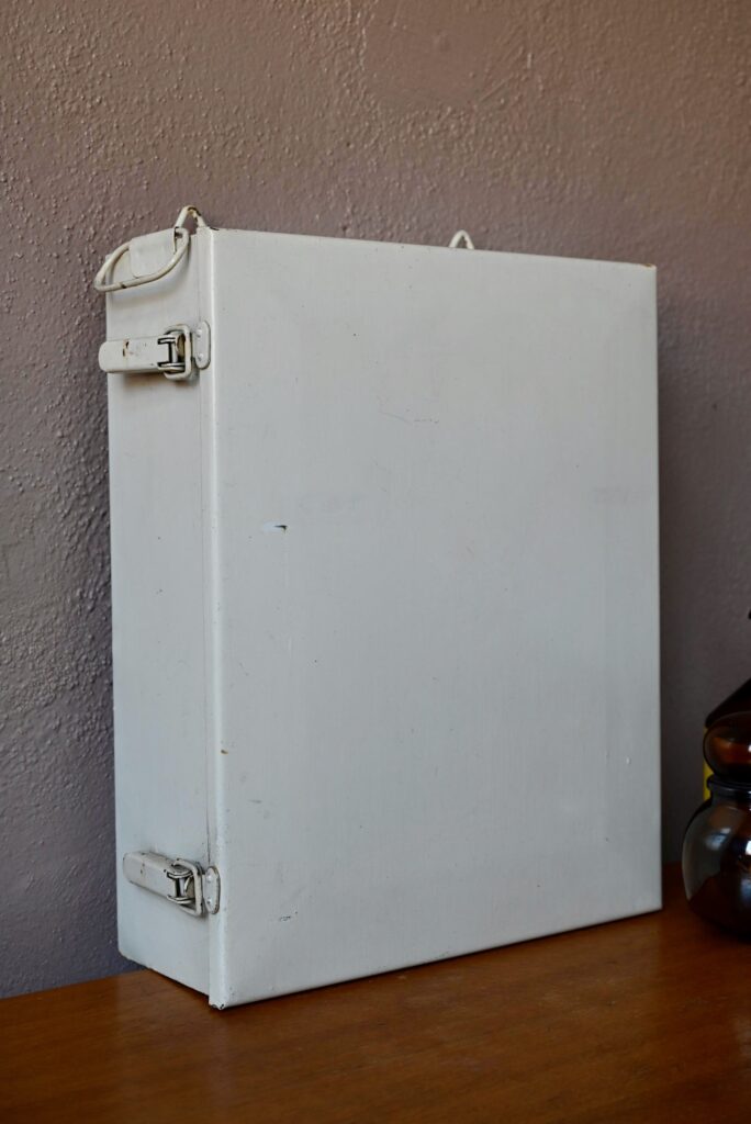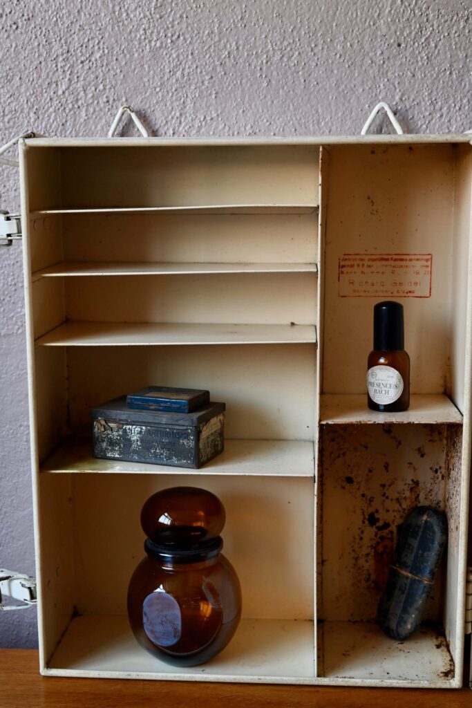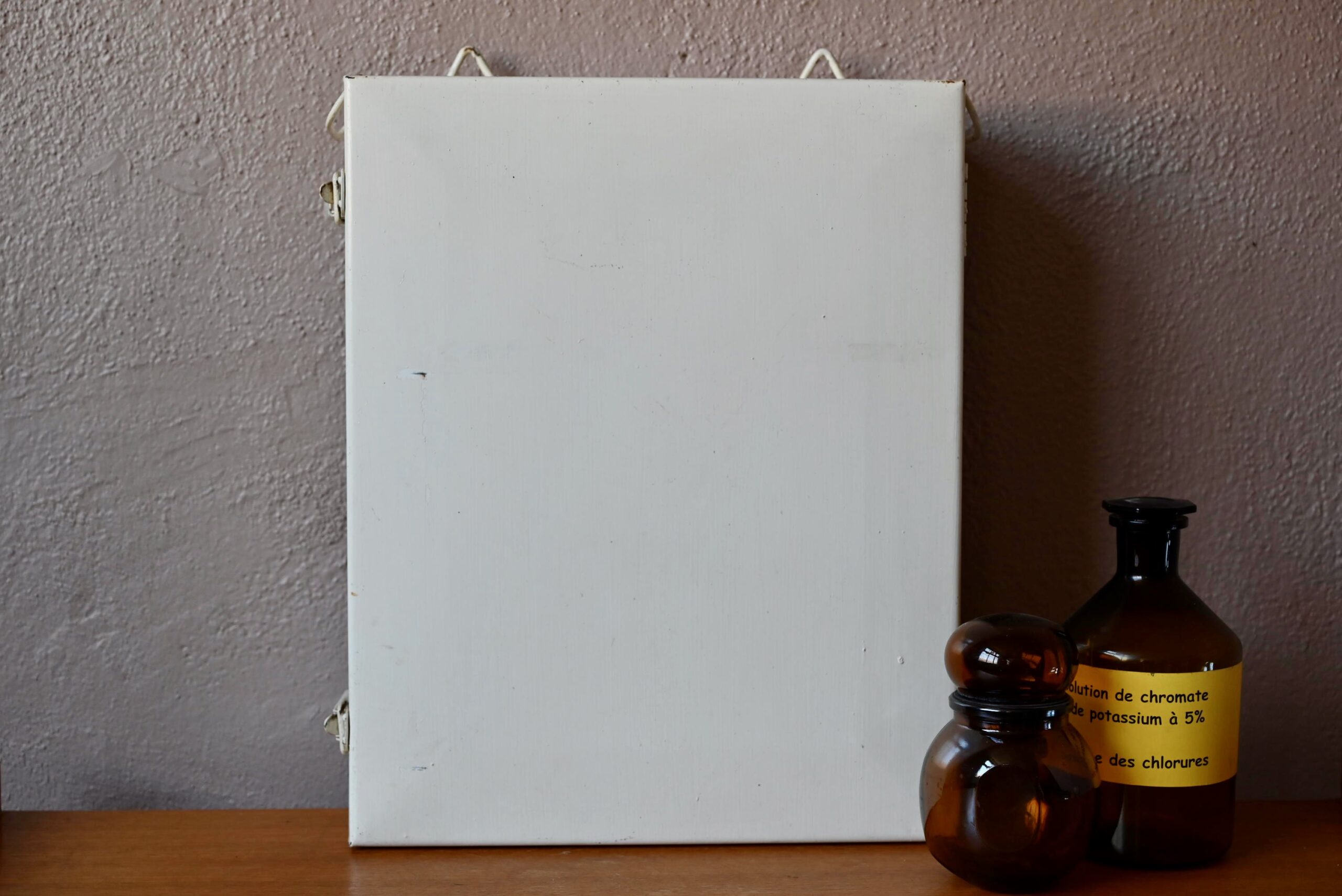 L’armoire murale est en métal peint en blanc, patiné par endroits. En bel état, l’intérieur est doté d’étagères. Des points d’oxydation sont visibles à l’intérieur du meuble. Des anneaux permettent sa suspension murale, une poignée son transport. A l’intérieur de la porte, la liste des accessoires est toujours présente !