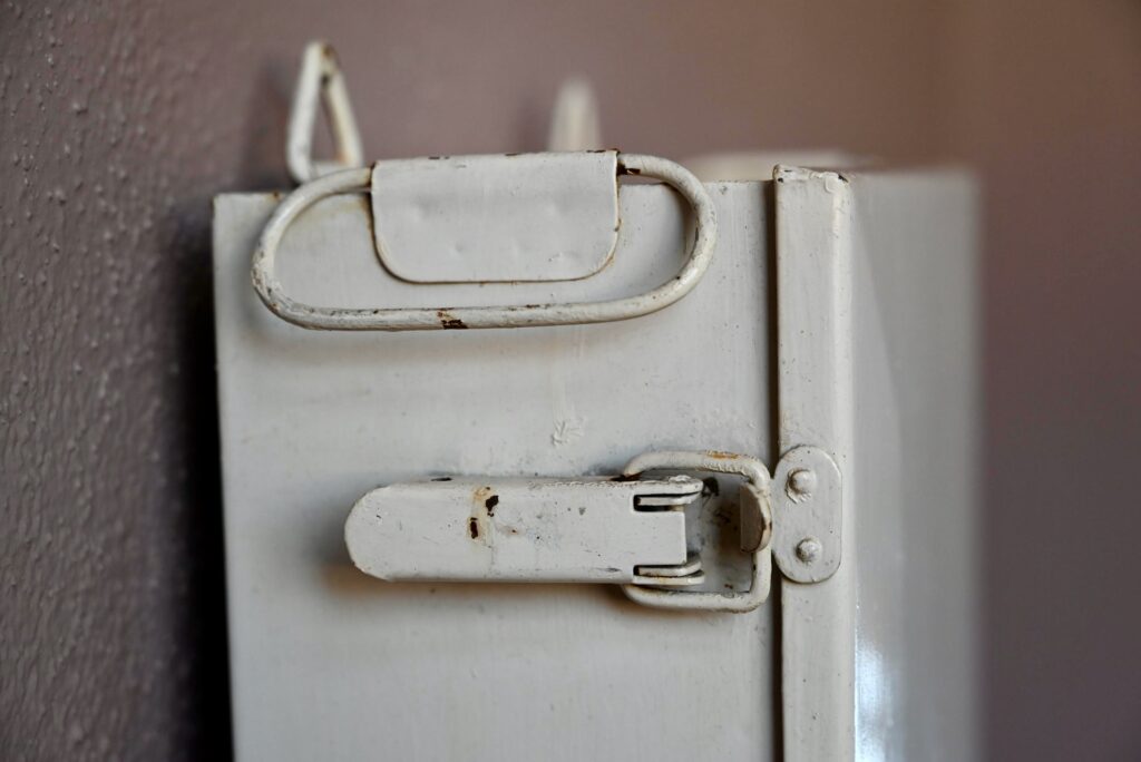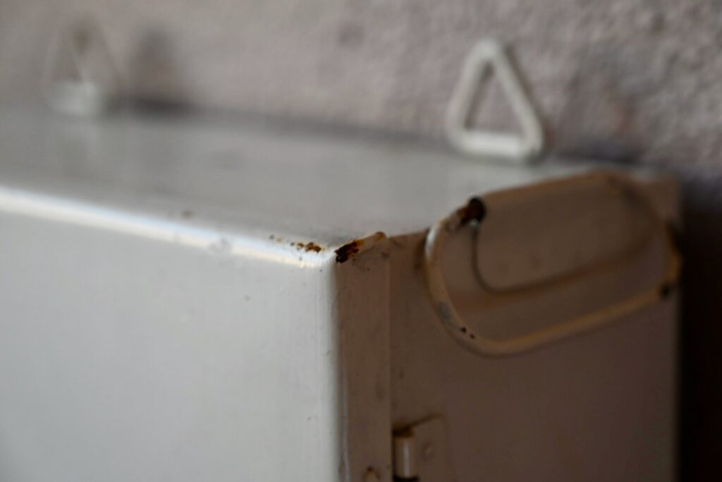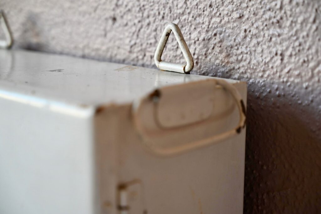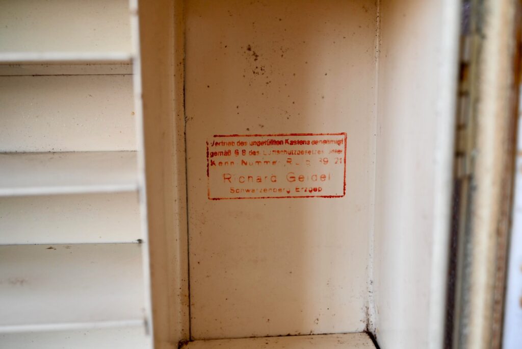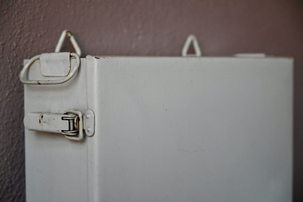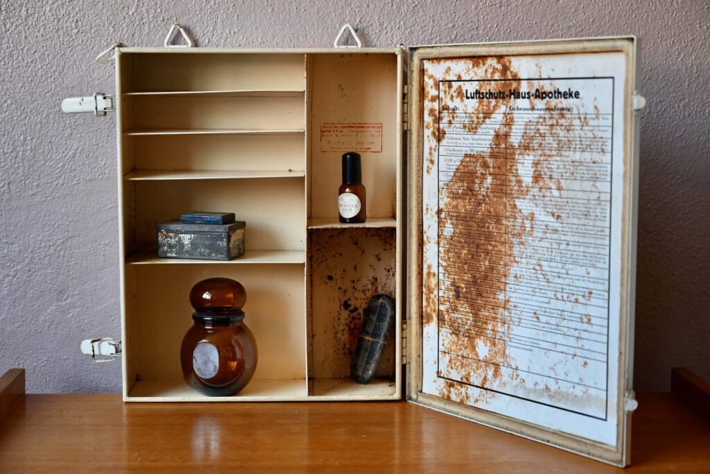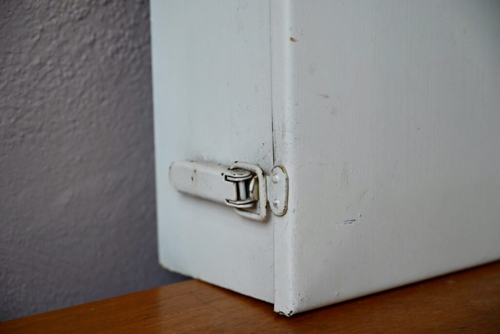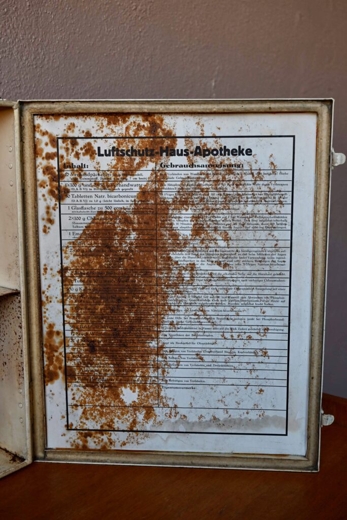 L’armoire murale est en métal peint en blanc, patiné par endroits. En bel état, l’intérieur est doté d’étagères. Des points d’oxydation sont visibles à l’intérieur du meuble. Des anneaux permettent sa suspension murale, une poignée son transport. A l’intérieur de la porte, la liste des accessoires est toujours présente !