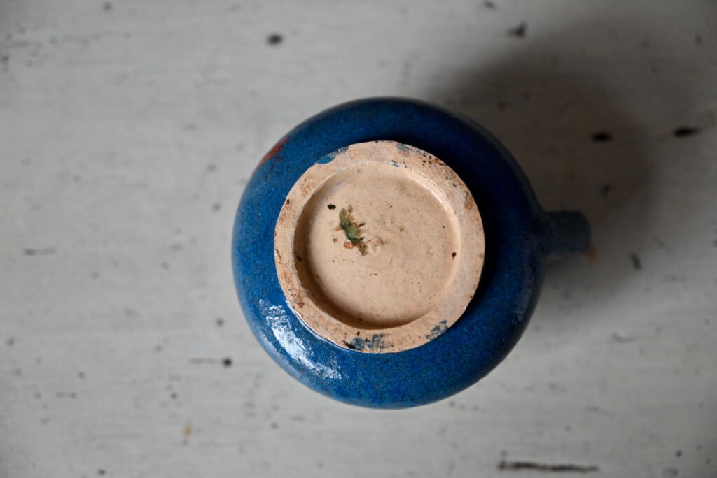 Le petit pichet est en bel état, réalisé en terre vernissée de Soufflenheim. Quelques traces d’usage sont visibles. C’est un bel objet d’art populaire à l’esprit campagne chic et bohème.