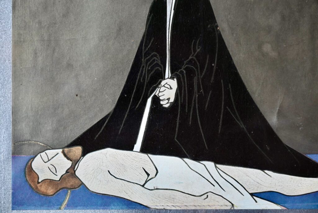 D’après une oeuvre originale de Jean Goulden en émail champlevé polychrome, cette reproduction polychrome est une Pietà particulièrement originale et saisissante.