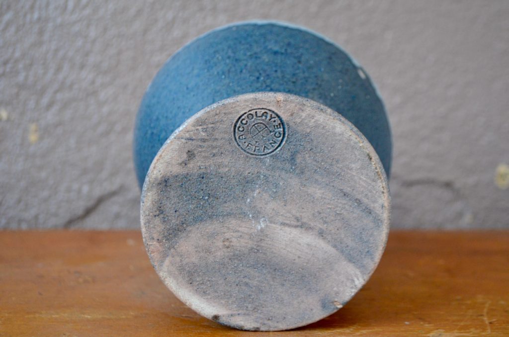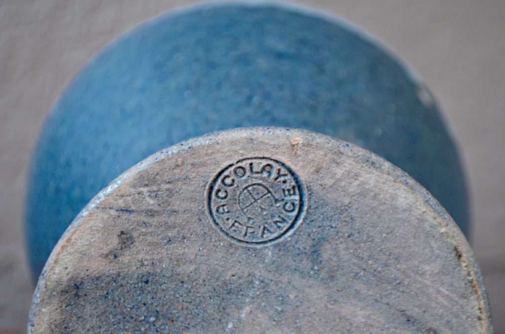 Cette charmante céramique est un pique-fleurs signé des Potiers d’Accolay. Originale, attachante et réalisée avec subtilité, nous apprécions sa forme “champignon”, servie par un joli travail d’émaillage épais, lumineux et nuancé. Dans un registre de bleu gris, le moucheté alterne avec les effets de mélange, le brillant glacé au rugueux texturé. Ce charmant petit vase se prêtera à toutes les compositions, florales et décoratives.