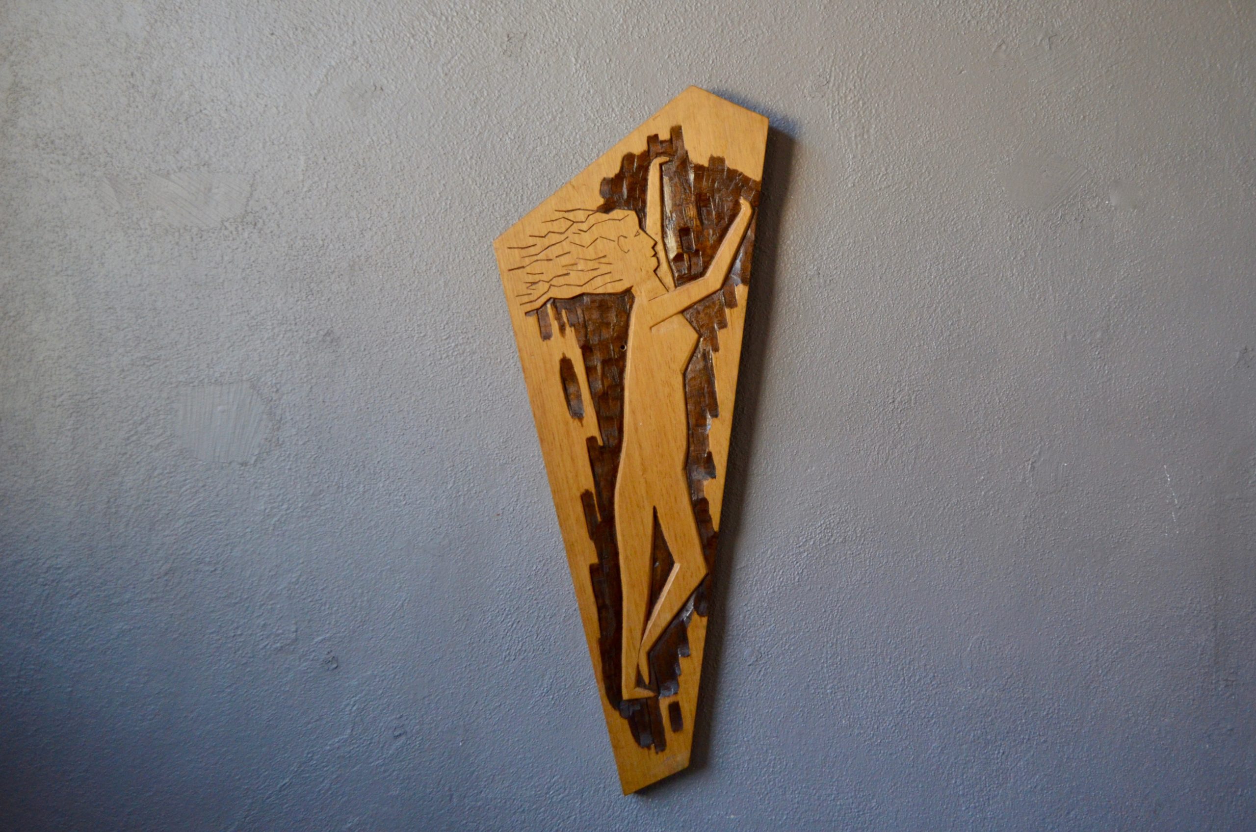 La planche est en bois, sculpté en relief dans un esprit anthroposophe. Un trou est à noter au centre de la planche.