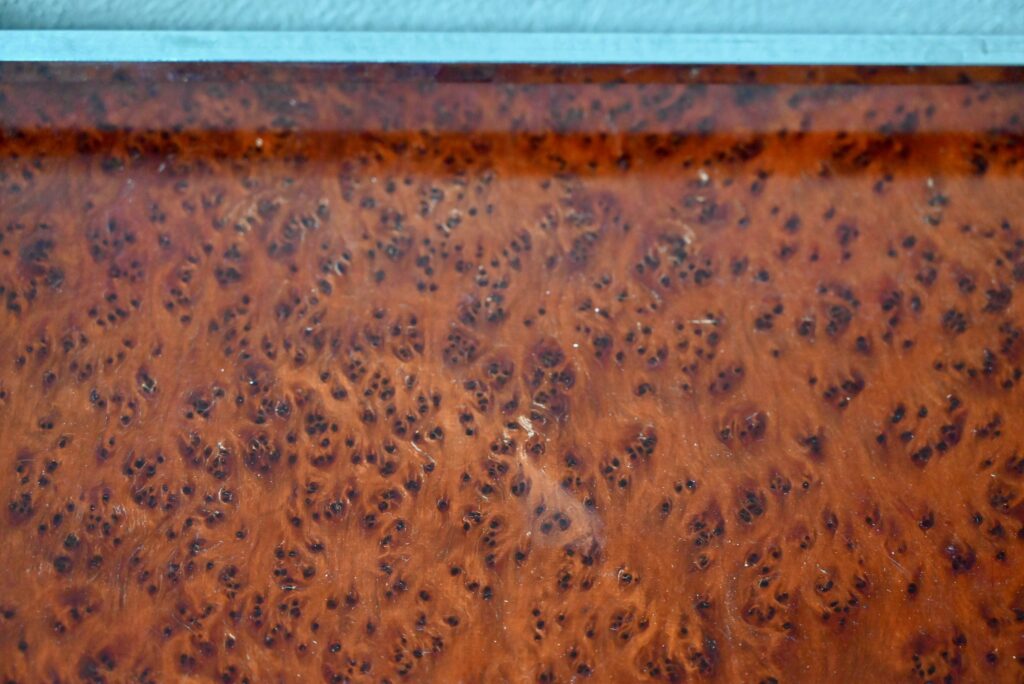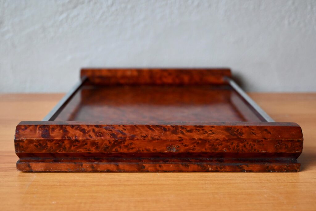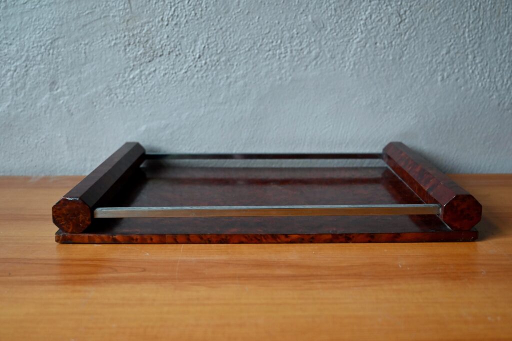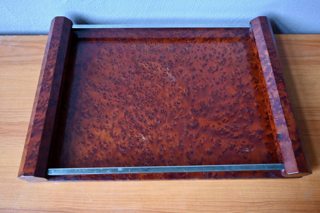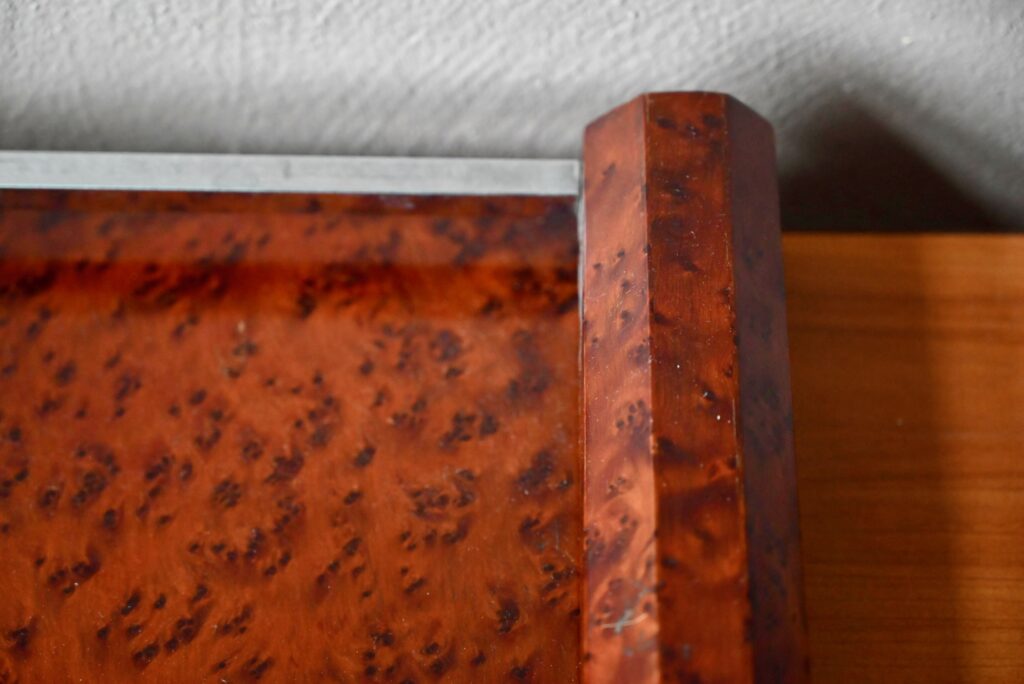 Le plateau est en métal chromé et bois, peint imitation “loupe de thuya”. Il date des années 40 et est en bel état. Quelques traces d’usage et rayures sont visibles en photo.