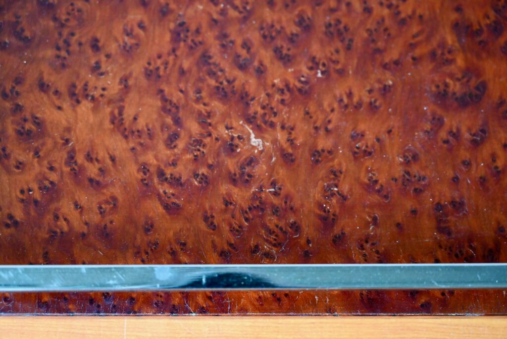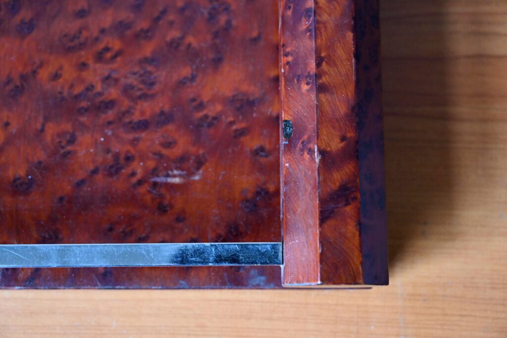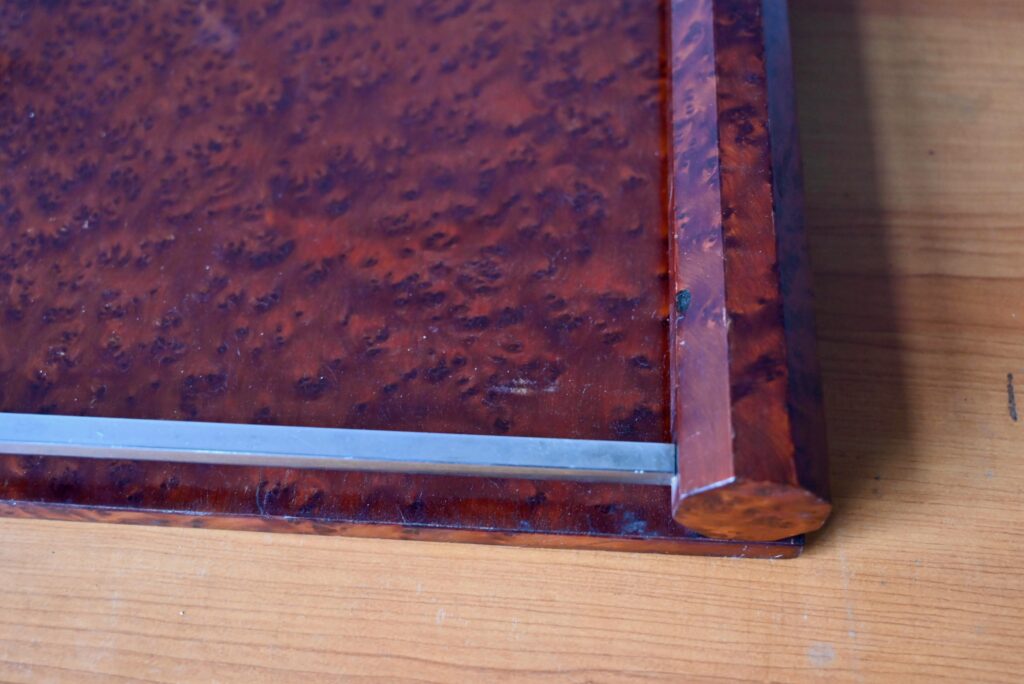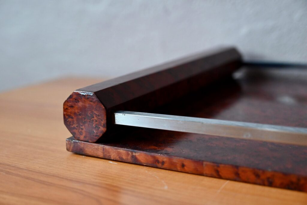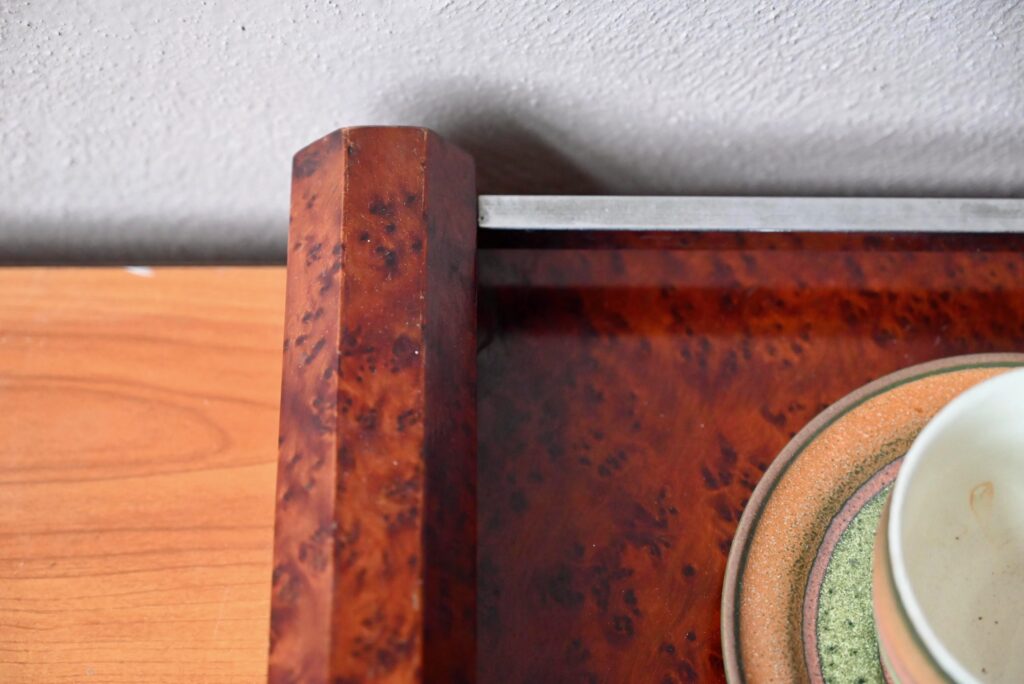 Le plateau est en métal chromé et bois, peint imitation “loupe de thuya”. Il date des années 40 et est en bel état. Quelques traces d’usage et rayures sont visibles en photo.