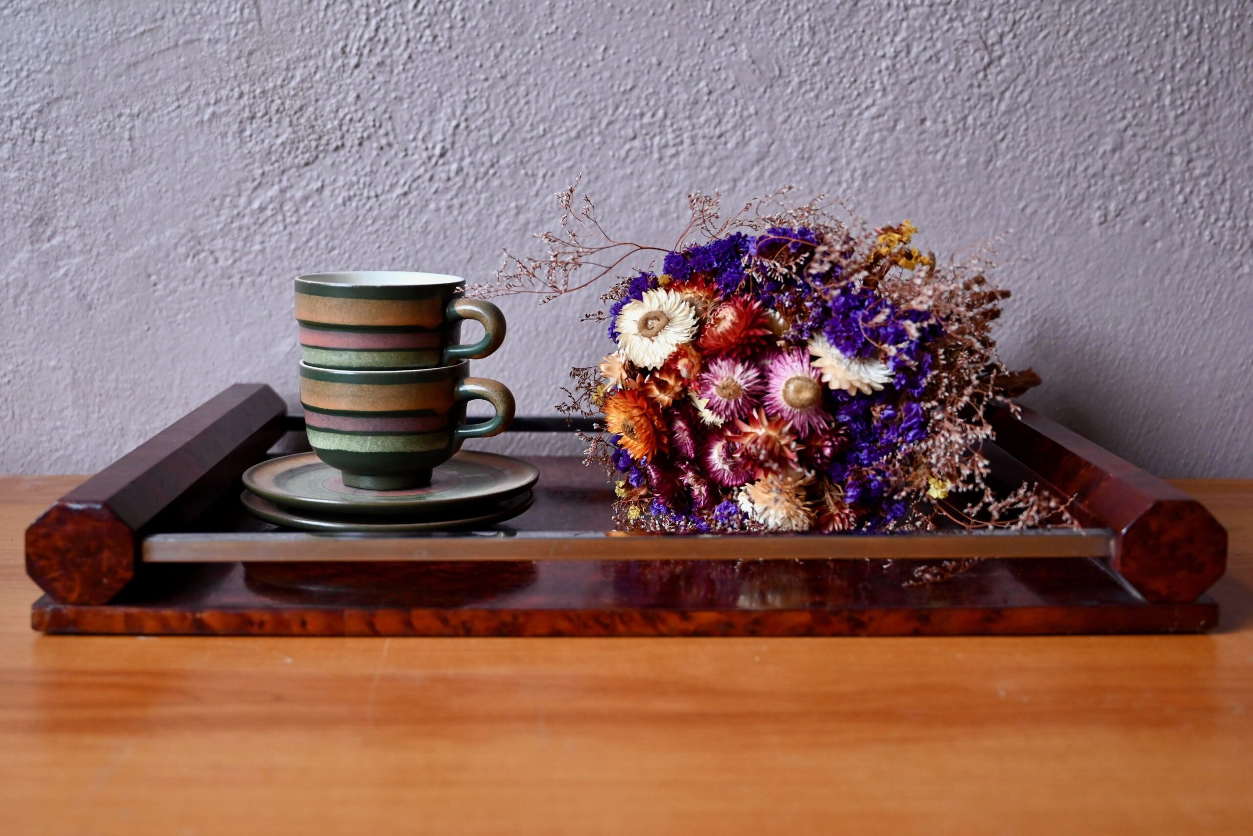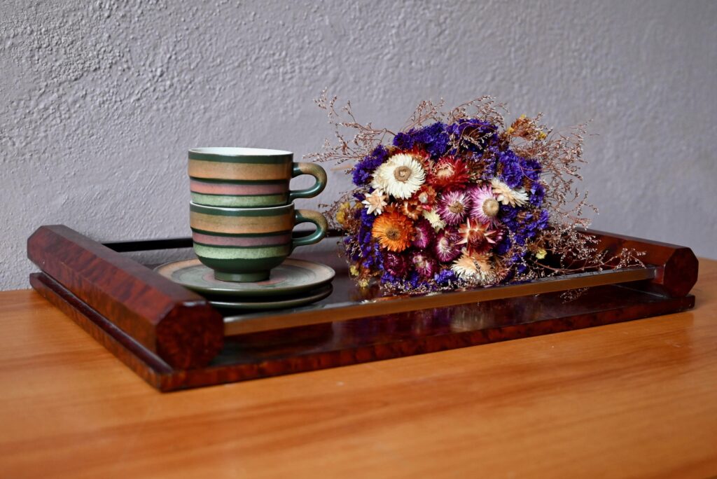 Avec ses formes géométriques et ses matériaux joliment associés, ce plateau à l’esprit Art Déco saura apporter sa touche rétro et précieuse! Poignées chromées et peinture imitant la loupe de thuya, un petit air Gatsby s’invitera à l’heure du thé!