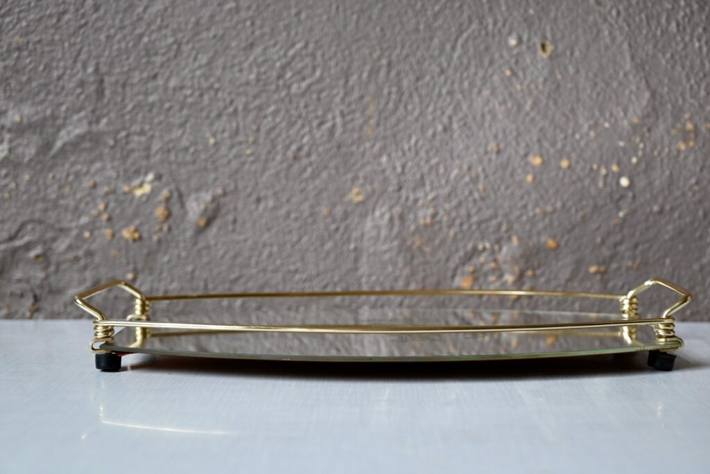 Ce plateau ovale est de forme étroite et allongée. Il est constitué d’un miroir gravé de motifs végétaux, tenu par une bordure et poignées en métal doré. Il est en très bel état. Fonctionnel et objet décoratif à part entière, il peut être détourné en présentoir ou dessous de plantes.