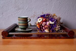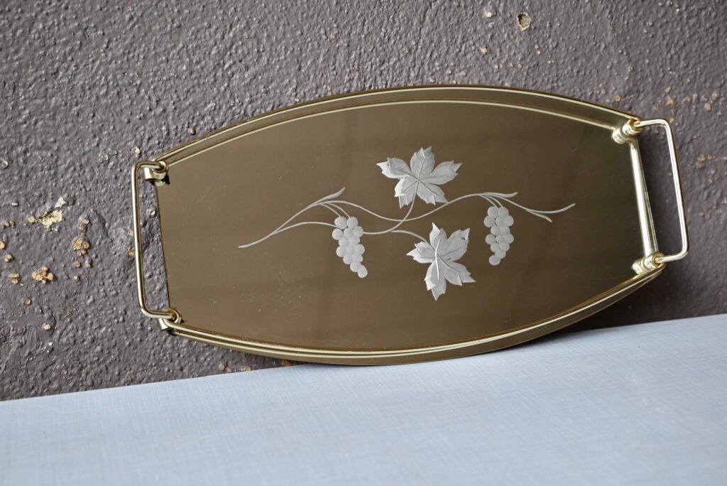 Ce plateau de service est vintage et bohème. Très décoratif et surprenant avec son miroir décoré de grappes de raisin et de sarments. Nous apprécions son côté chic et précieux.