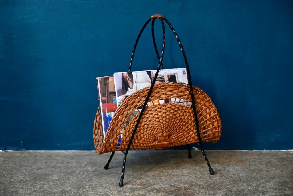 Ce porte-revues vintage est le genre de petite pièce déco qui fait toute la différence. Le mélange des matières, l’osier et le fer torsadé, sa forme originale et son côté pratique avec sa haute poignée le placent dans la catégorie des accessoires “coup de cœur”. Utile pour y ranger disques anciens ou revues actuelles, il trouvera facilement sa place dans un joli salon.