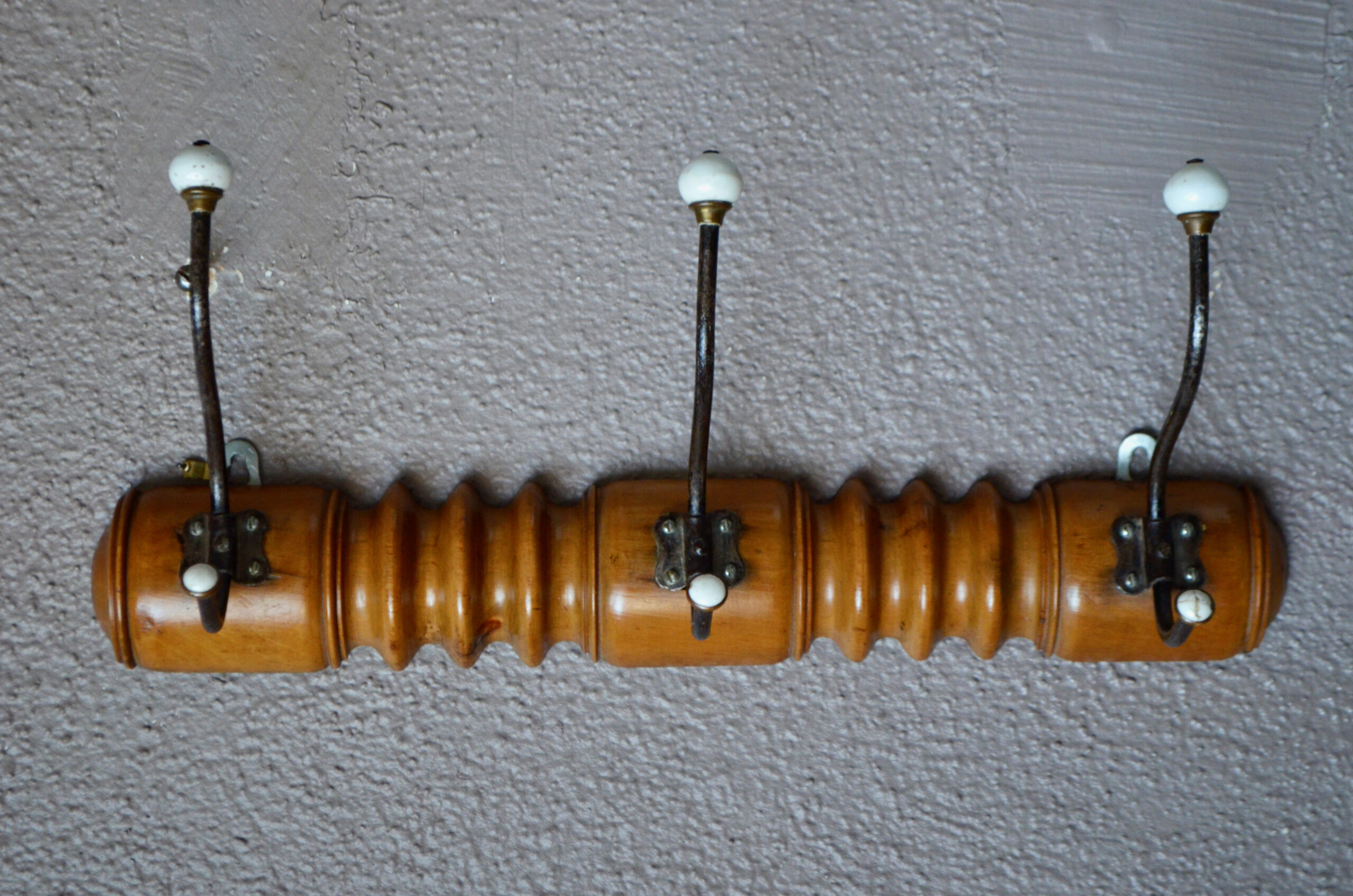 Un esprit 1900 ou Belle Époque souffle sur l’Atelier grâce à ces jolies patères. Mariage réussi du bois tourné, du métal et de la porcelaine, ce joli porte-manteaux mural possède un charme tout à fait conforme à l’ambiance des brasseries parisiennes des années 1900. Avec ses crochets en volutes, ce porte-manteaux ancien permettra d’accrocher vestes, sacs et chapeaux et apportera une note rétro à votre déco.
